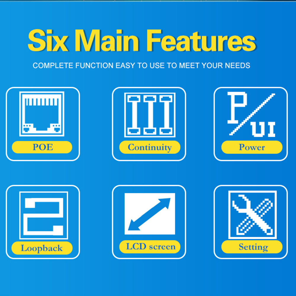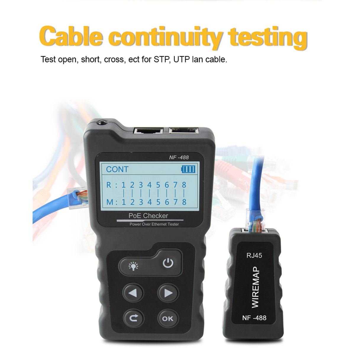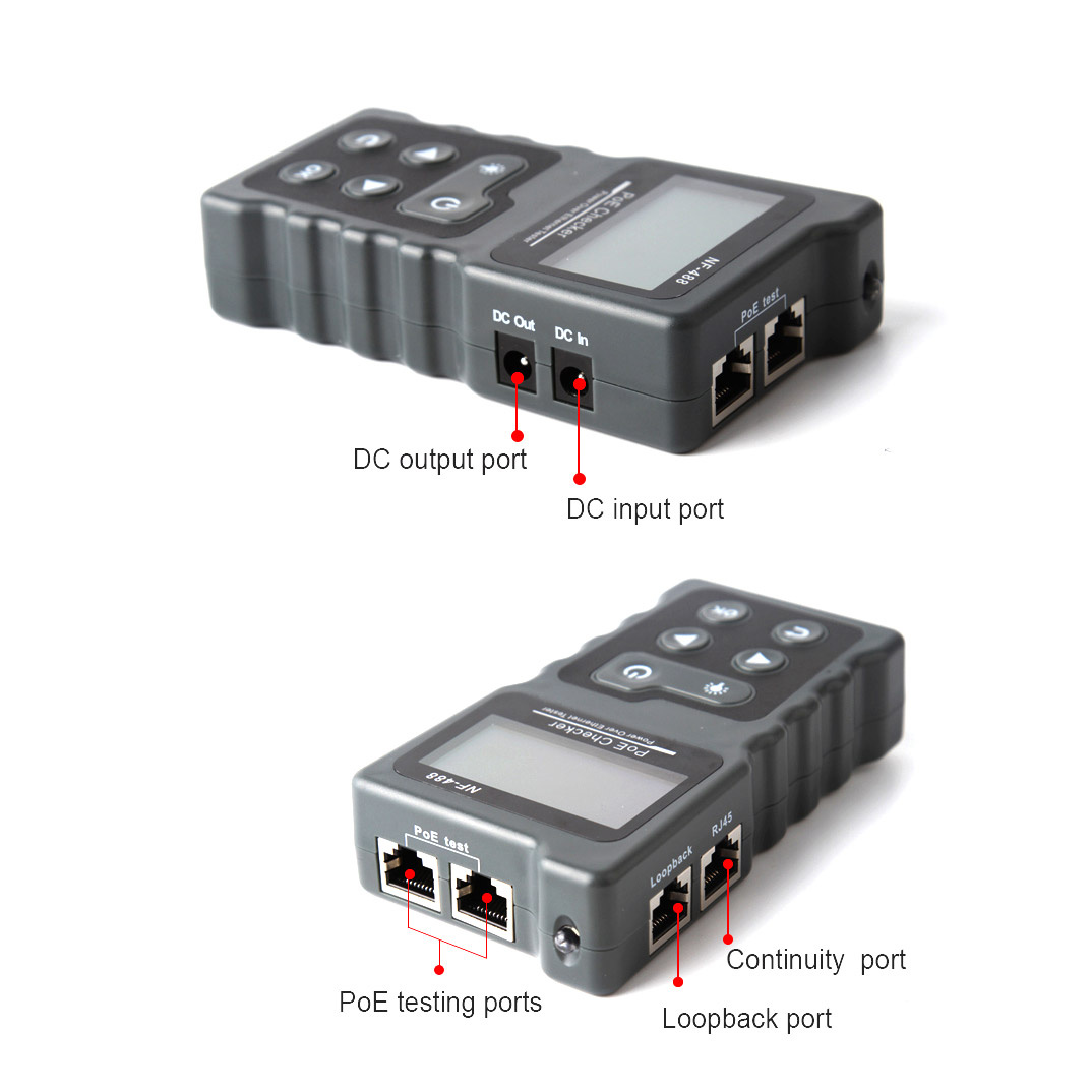 Noyafa NF-488 jest niezastąpionym urządzeniem do testów instalacji z PoE. Urządzenie rozpoznaje na których liniach występuje napięcie, podaje jego wartość oraz określa standard PoE. Można je również włączyć szeregowo pomiędzy switch a zasilane urządzenie, dzięki czemu uzyskamy informację o poborze prądu i pobieranej przez odbiornik mocy.