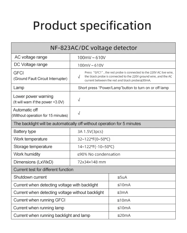 Urządzenie służy do szybkiej i bezpiecznej weryfikacji obecności napięcia przemiennego (AC) i stałego (DC) w zakresie od 100 mV do 610 V. Noyafa NF-823 to kompaktowy detektor cyfrowy, idealny zarówno dla elektryków zawodowych, jak i użytkowników domowych. Dzięki wbudowanemu inteligentnemu czipowi, pomiar jest wykonany w ciągu 0,5 sekundy z błędem zbliżonym do „zera”, co zapewnia wiarygodność wyników nawet przy niskich poziomach napięcia.