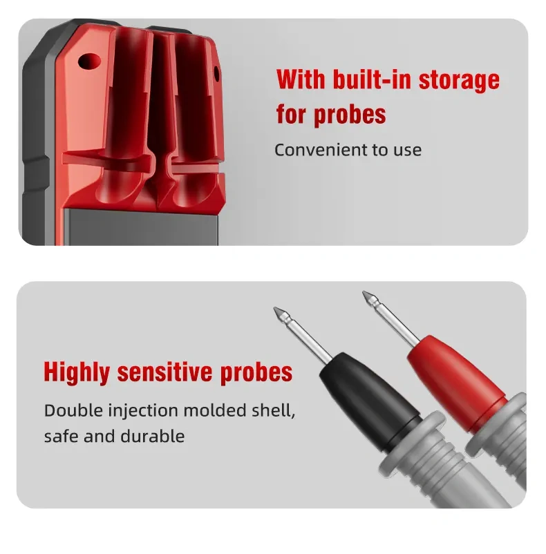 - Przewody pomiarowe: Wysokiej jakości, z uchwytem na tylnym panelu.
