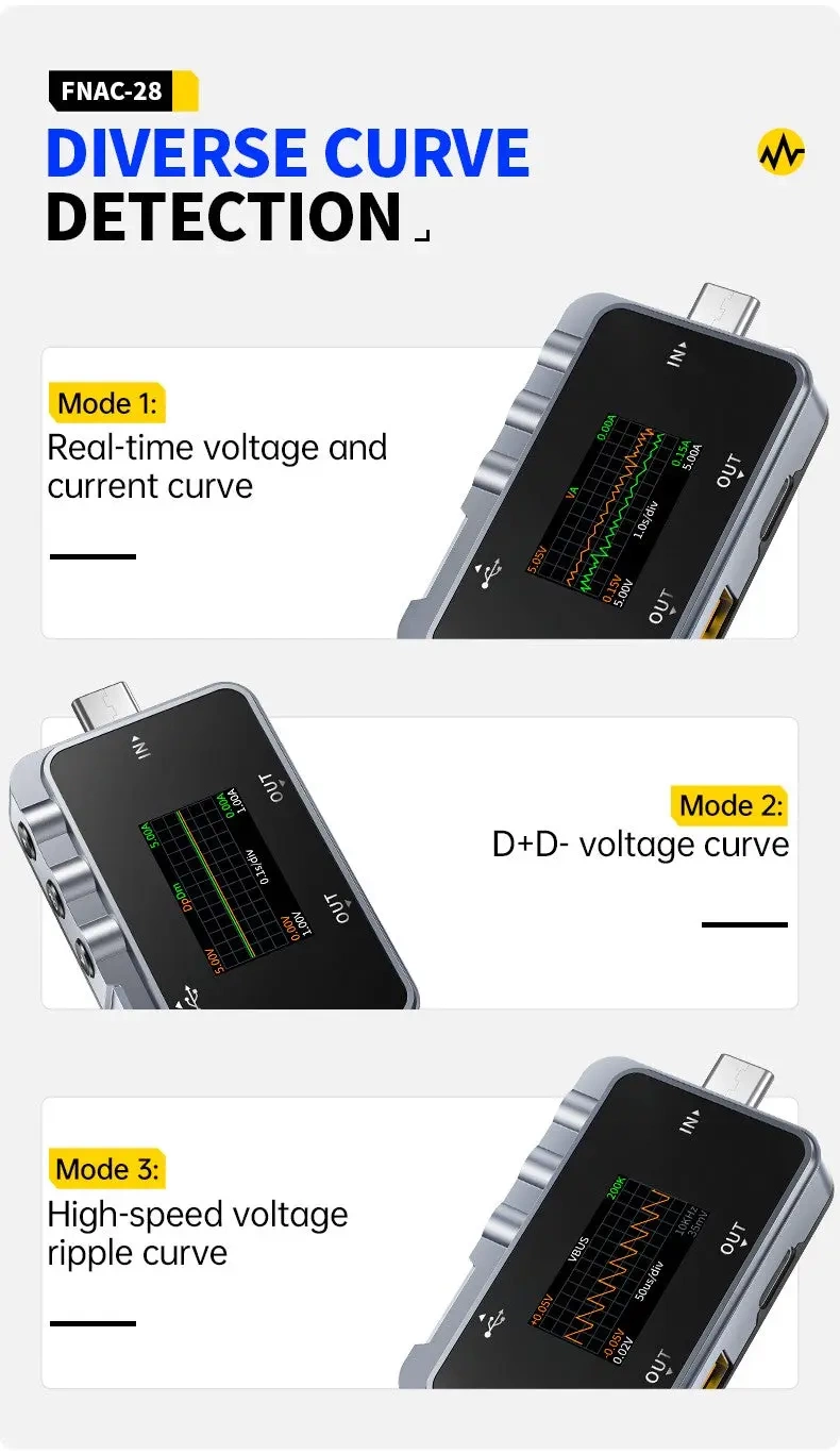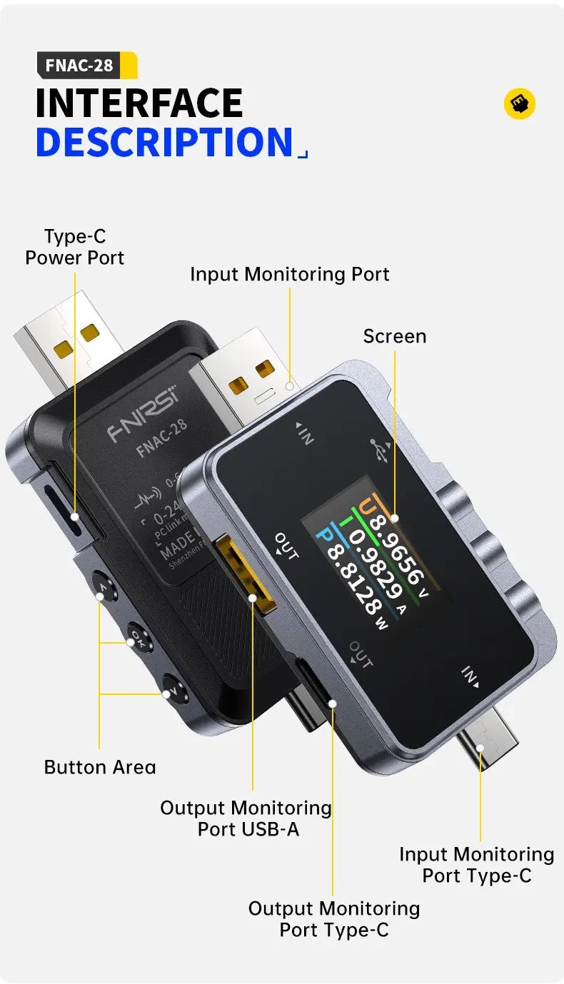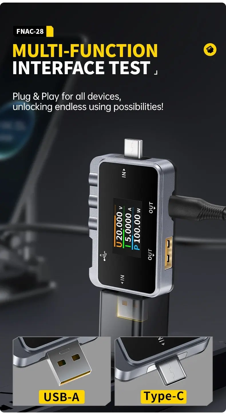 FNIRSI FNAC-28 to specjalistyczne urządzenie służące do testowania portów USB-C. Pozwala na precyzyjny pomiar napięcia i prądu ładowania, a także analizę protokołów komunikacyjnych wykorzystywanych podczas ładowania urządzeń mobilnych. Dzięki temu testerowi można zdiagnozować problemy związane z ładowaniem, zweryfikować wydajność ładowarek i power banków oraz ocenić jakość kabli USB-C.