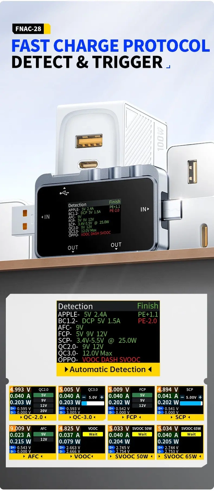 - Wykrywanie protokołu: 1QC2.0 5V 9V 12V 20V; 2QC3.0 3,4-20V; 3FCP 9V 12V 20V; 4SCP 5.5-6.0V; 5AFC 9V 12V; 6VOOC/WARP; 20V; 7SVOOC 1.0; 8SVOOC 2.0