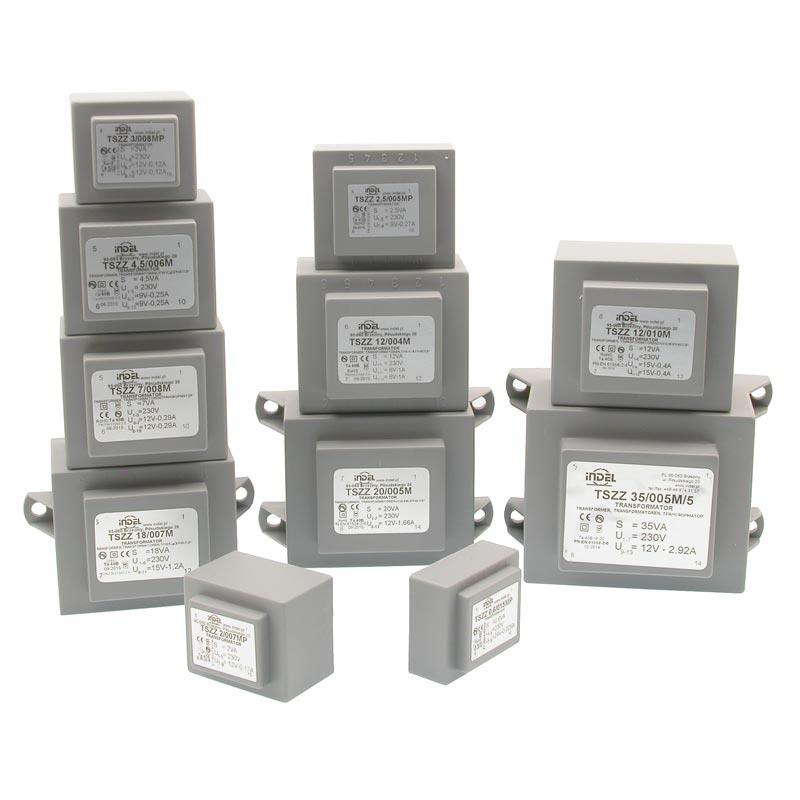 Seria TSZZ - transformatory sieciowe wykonane na rdzeniach kształtkowych EI w obudowach zalewanych żywicą, ze standardowym wyprowadzeniem końcówek do montażu na płytkach drukowanych. Powszechnie stosowane w elektronice profesjonalnej i amatorskiej. Służą do wbudowania w układach zasilających urządzeń elektronicznych i elektroenergetycznych. Dodatkowym ich atutem jest estetyczna obudowa stanowiąca atrakcyjną formę zewnętrzną, która pozwala na większą ochronę mechaniczną. Hermetyczne zalanie żywicą powoduje, iż są odporne na wilgoć i agresywne czynniki zewnętrzne i dlatego z powodzeniem mogą być stosowane na zewnątrz urządzeń i budynków.