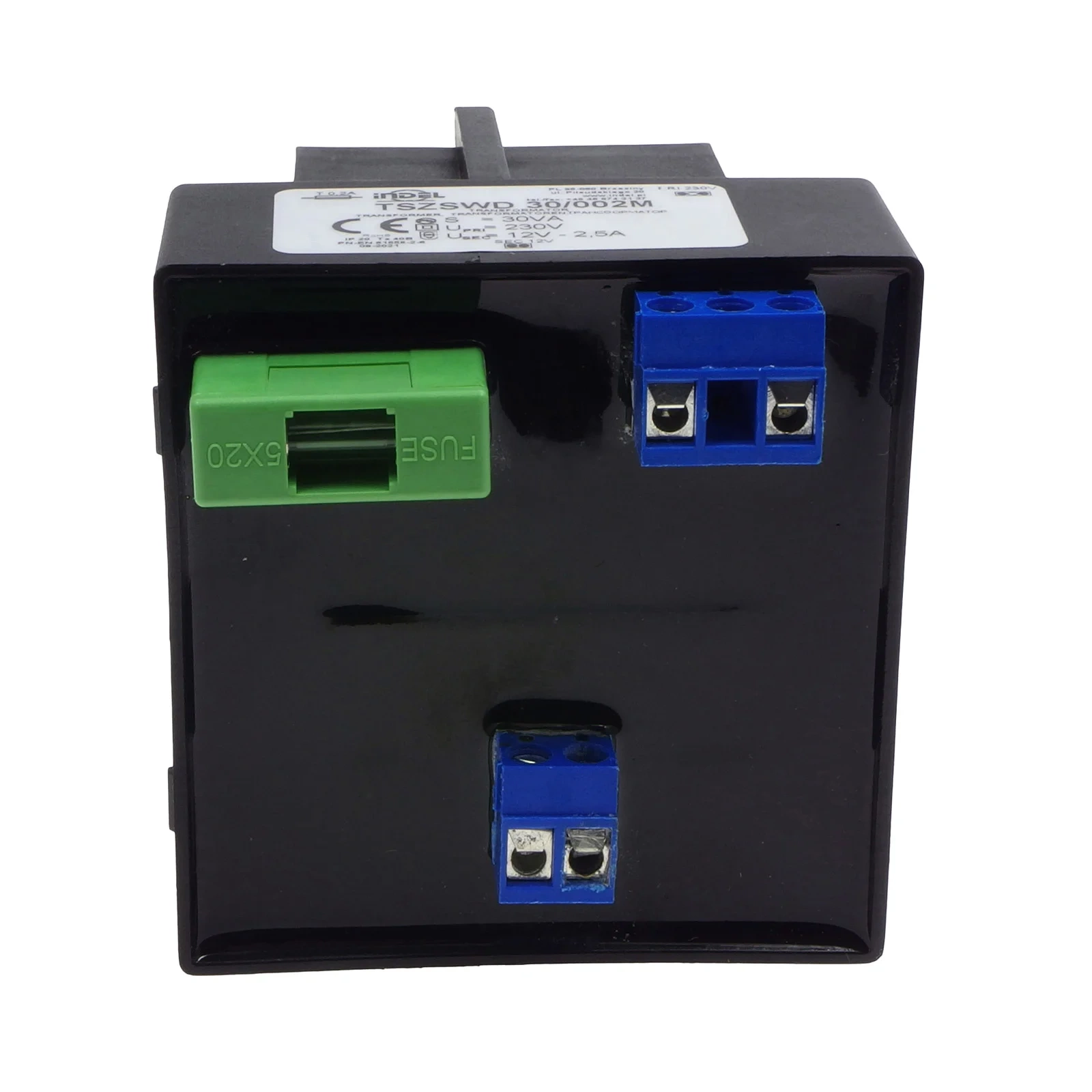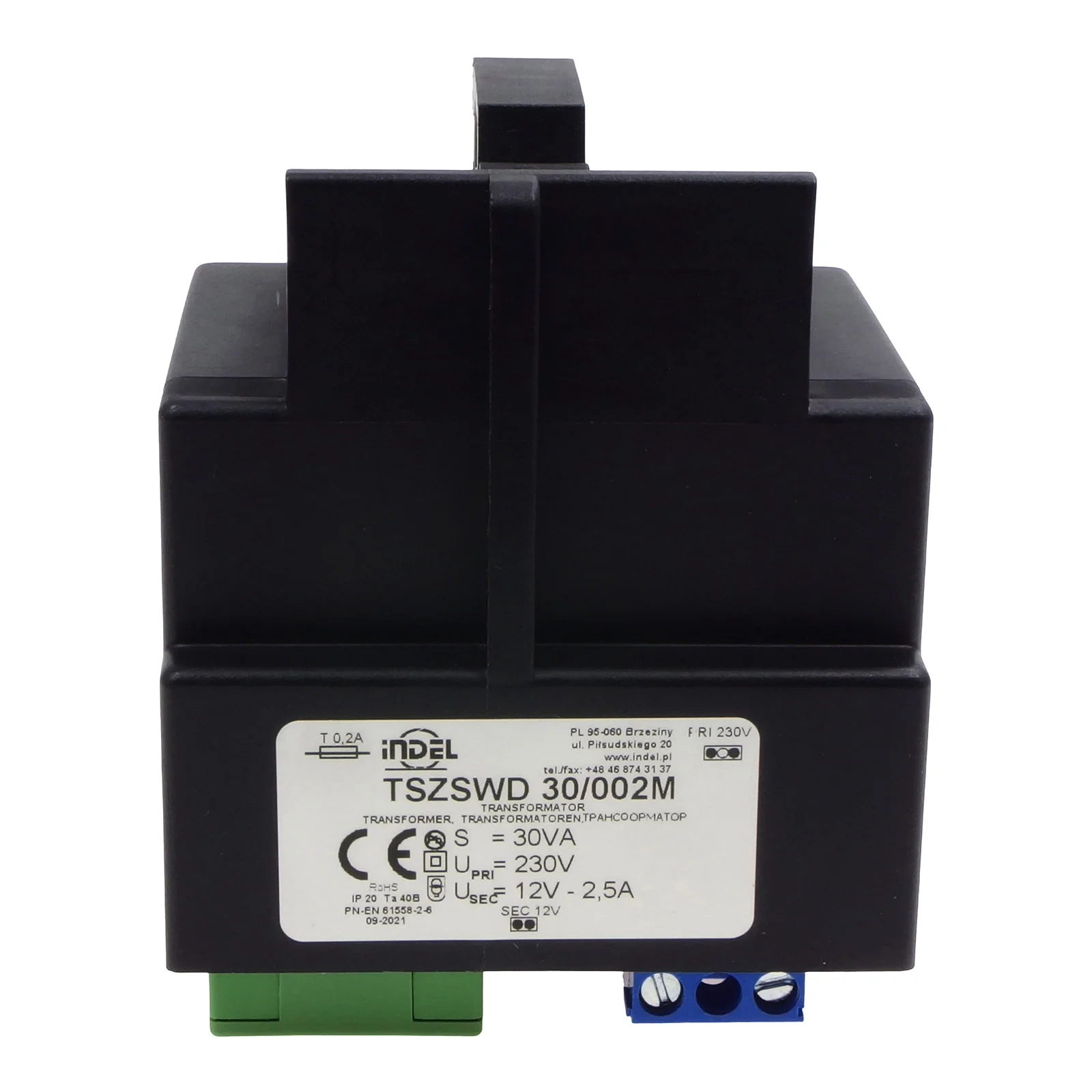 Transformator z serii TSZSWD produkowany przez firmę INDEL to zalewany żywicą transformator sieciowy, zaprojektowany do montażu na szynie DIN (TS35). Dzięki kompaktowej budowie i estetycznej obudowie z niepalnego tworzywa wzmocnionego włóknem szklanym, jest odporny na wilgoć oraz agresywne czynniki zewnętrzne. Transformatory serii TSZSWD są powszechnie stosowane w układach zasilających maszyn i urządzeń elektroenergetycznych oraz w instalacjach przemysłowych. Często wykorzystywane jako transformatory bezpieczeństwa i separacyjne.