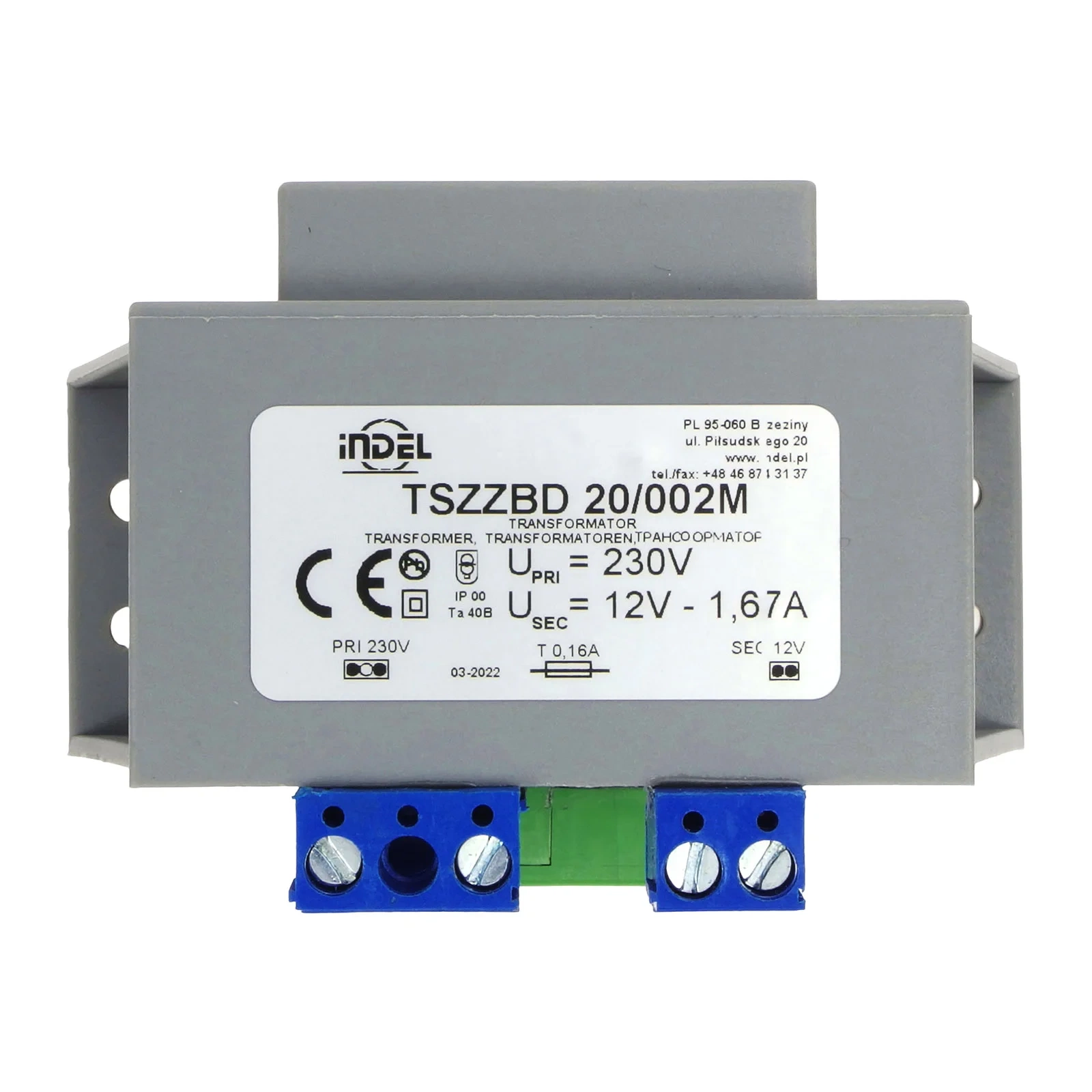 Transformator sieciowy TSZZBD 20/002M [230V/12V-1,66A] do domofonów, wyprowadzenia: listwa zaciskowa
