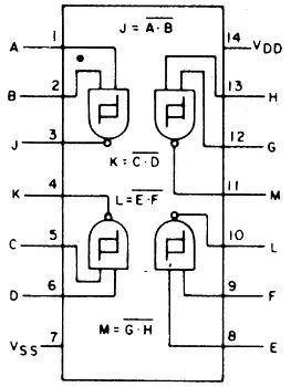 CD4093 SMD Cztery 2-wejściowe bramki NAND z układem Schmitta, napięcie zasilania 3-15 V, poziomy we. VIL/VIH 30/70% VCC, opóźnienie bramki 40 ns, pobór mocy na bramkę (statyczny) 0,1 mW, zakres temperatur -40 - + 85 st C, obudowa SO14