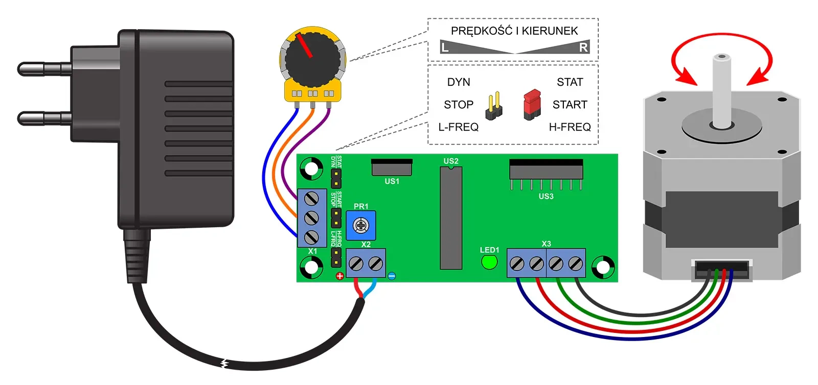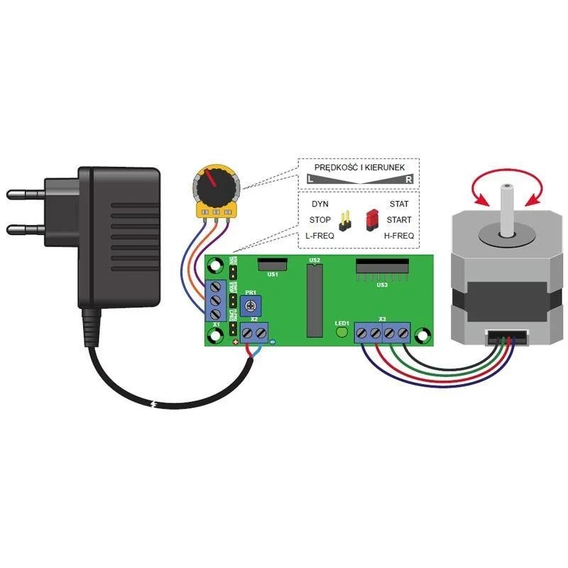 Sterownik silnika umożliwia płynną regulację prędkości obrotowej i kierunku obrotów silników krokowych bipolarnych (4-przewodowych) i unipolarnych (5-, 6- lub 8- przewodowych) za pomocą jednego potencjometru. Zakres zmian prędkości wirowania osi silnika podzielono na dwa podzakresy 1 ÷ 10 lub 7 ÷ 100 cykli na sekundę.