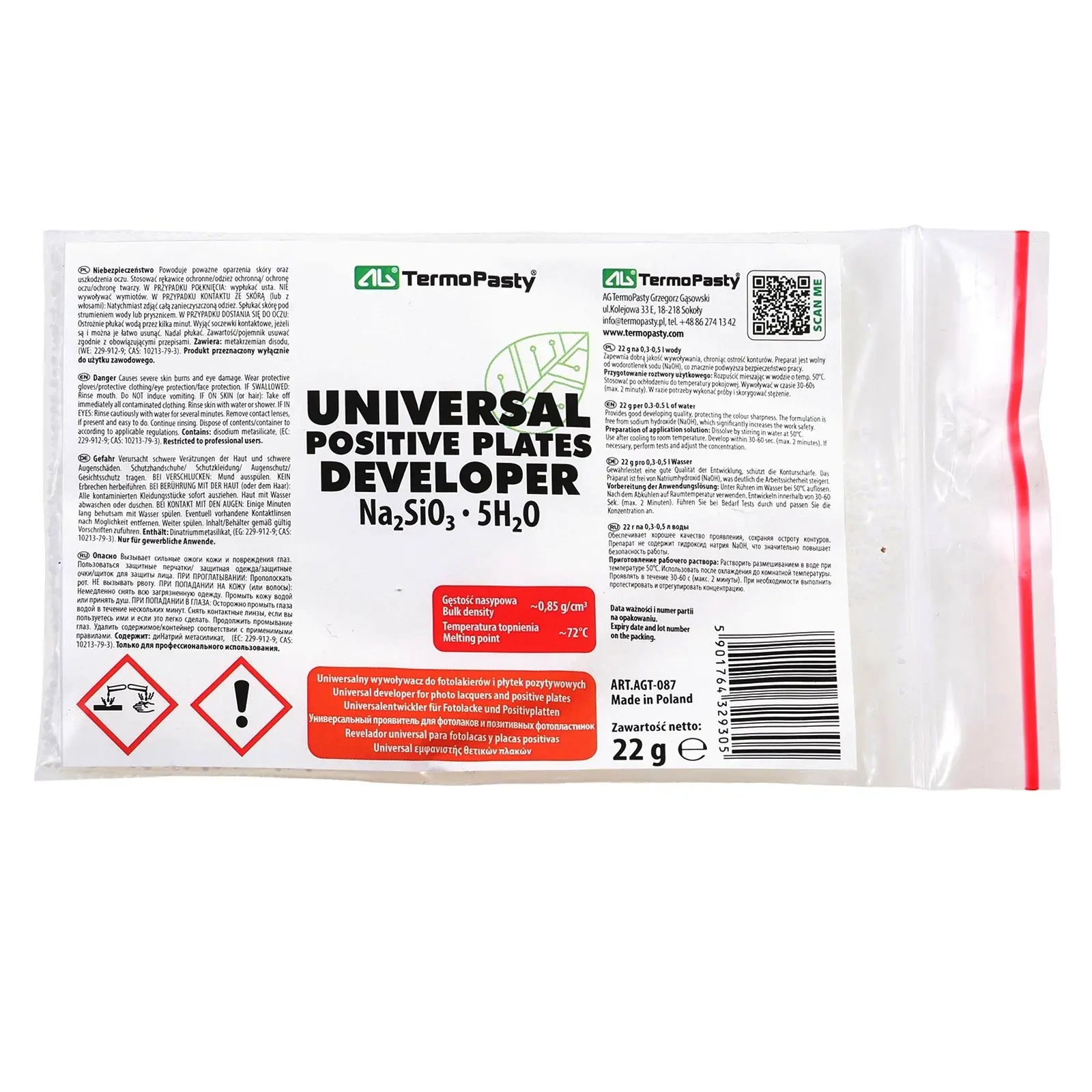 Uniwersalny wywoływacz do fotolakierów i płytek pozytywowych. Zapewnia dobrą jakość wywołania, chroniąc ostrość konturów. Preparat jest wolny od NaOH, co znacznie podwyższa bezpieczeństwo pracy