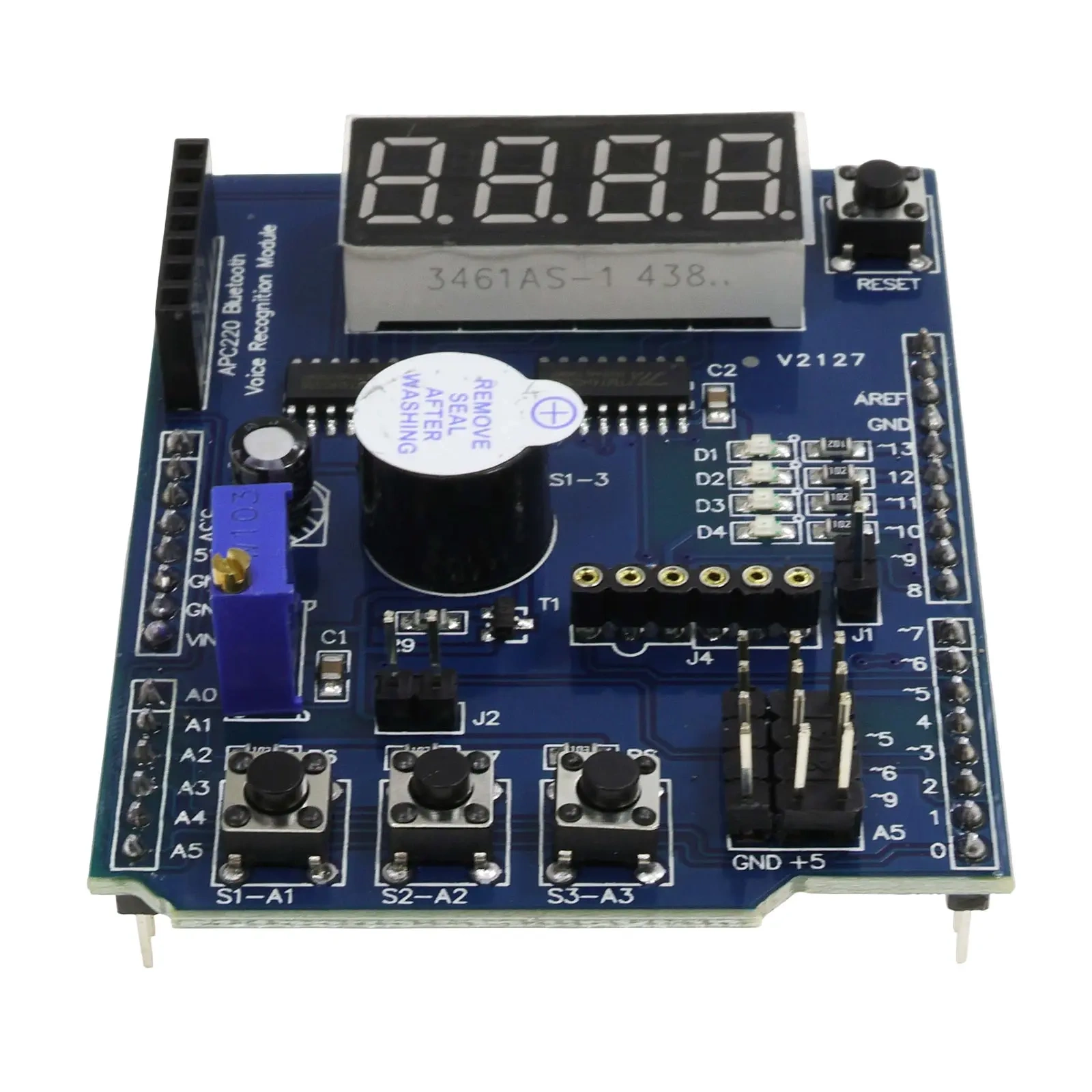 Rozszerzenie sprzętowe, wielofunkcyjny shield dedykowany do Arduino UNO, Leonardo i Mega2560. Dodatek ten posiada najczęściej wykorzystywane podzespoły elektroniczne i moduły takie jak: wyświetlacz cyfrowy LED, złącza do podłączenia czujników, buzzer, przyciski i diody LED.