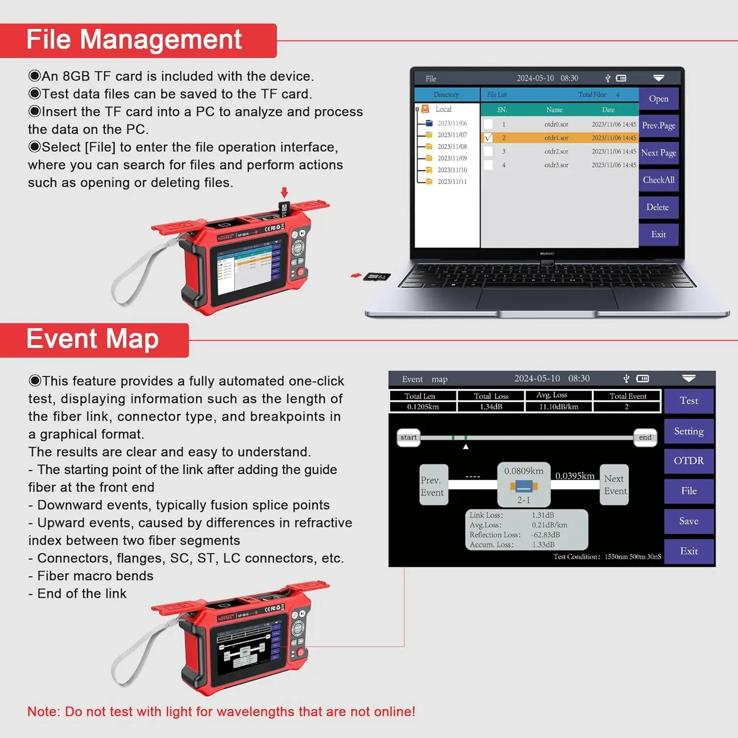 Zaawansowane algorytmy automatycznie identyfikują przerwy, zagięcia, złącza, splittery oraz koniec włókna. Funkcja Event Map przedstawia zdarzenia w formie prostego, czytelnego diagramu, co znacząco przyspiesza ocenę stanu instalacji oraz skraca czas napraw.