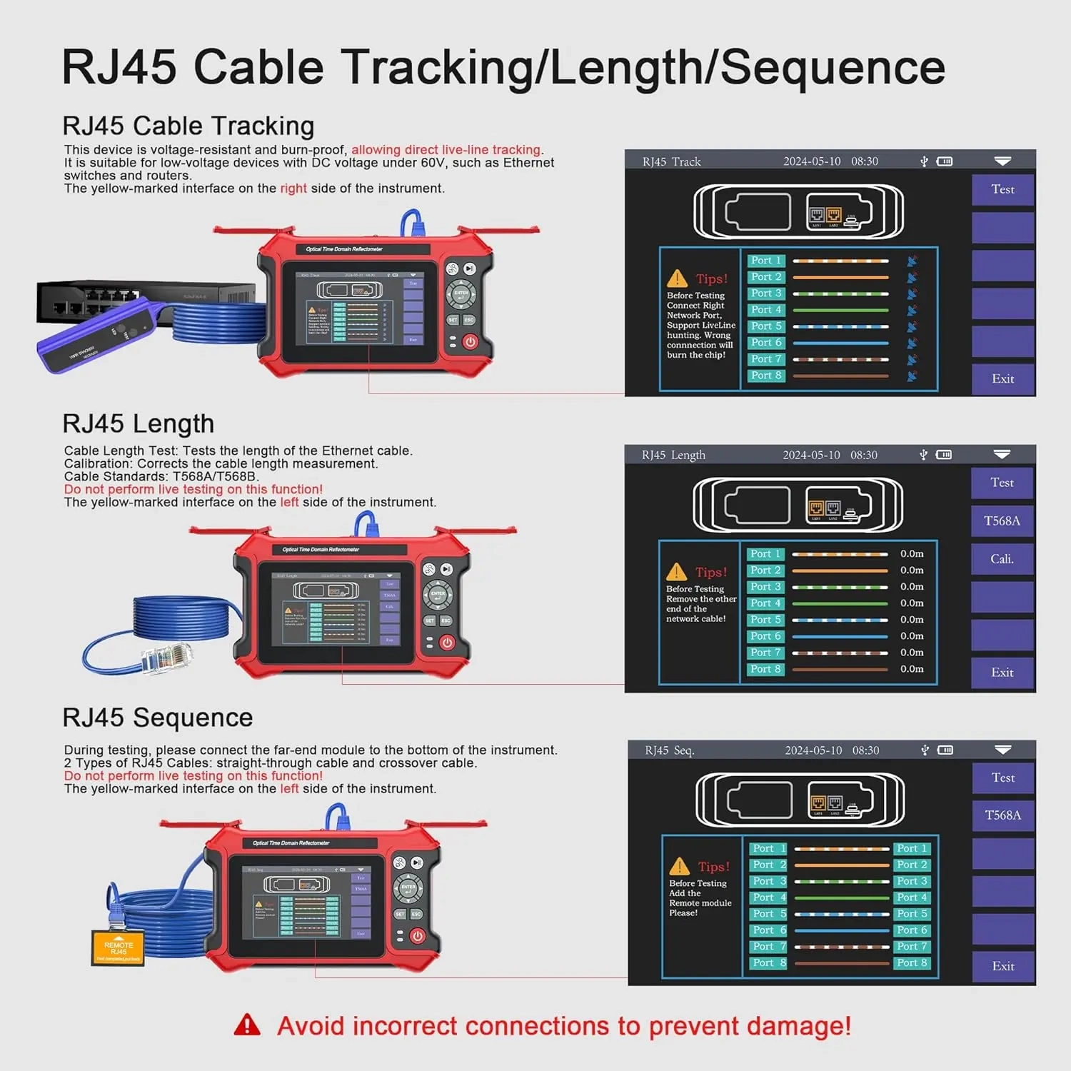 Noyafa OTDR Pro umożliwia testowanie okablowania RJ45, w tym wykrywanie zwarć, przerw, skrzyżowań i błędów sekwencji. To praktyczne narzędzie do utrzymania sieci Ethernet, idealne dla administratorów i instalatorów.
