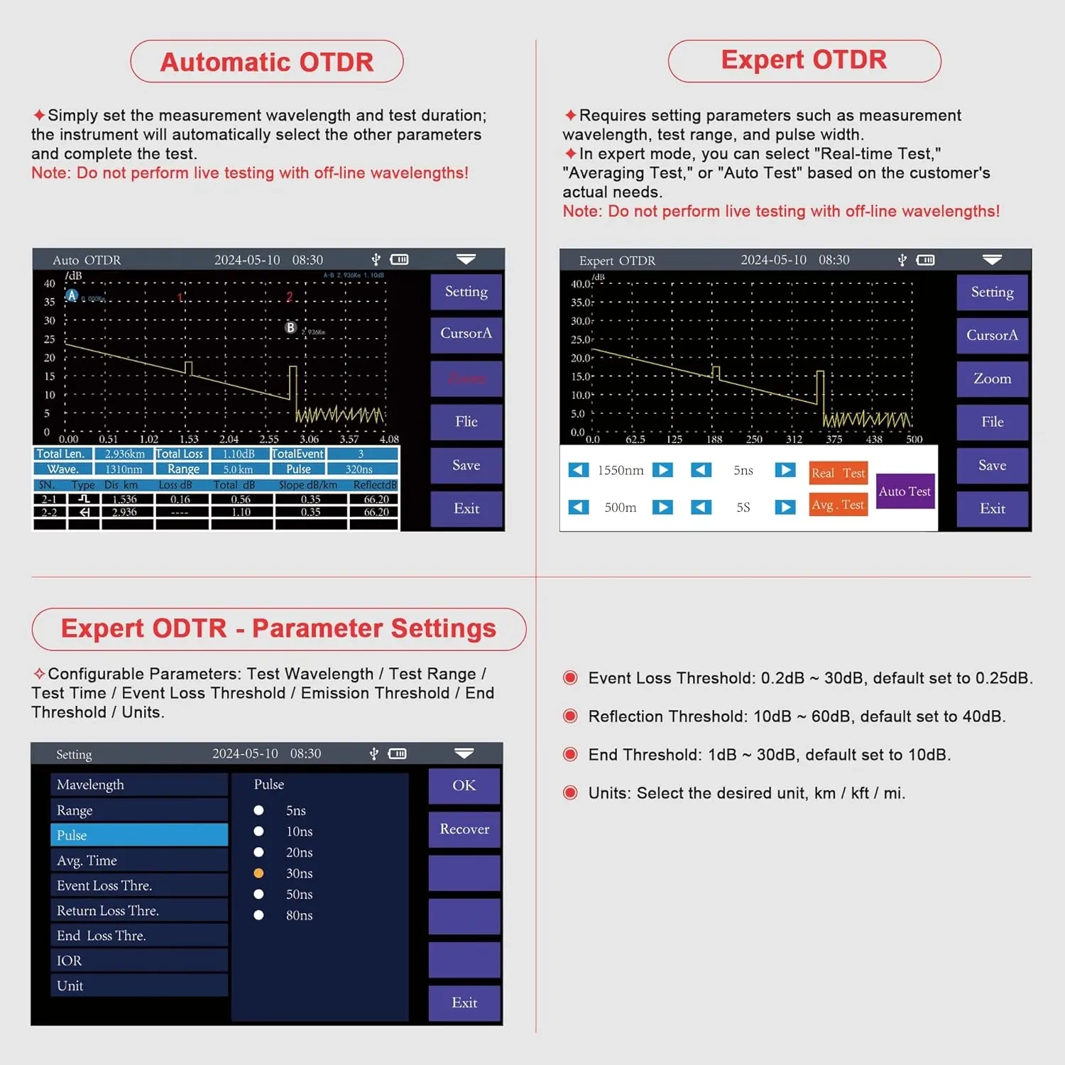 Tryb Auto OTDR pozwala wykonać kompletny pomiar jednym kliknięciem. Dla zaawansowanych użytkowników dostępny jest tryb Expert, umożliwiający manualne ustawienie długości fali, szerokości impulsu, zakresu oraz kluczowych parametrów pomiarowych. To idealne połączenie prostoty i kontroli.