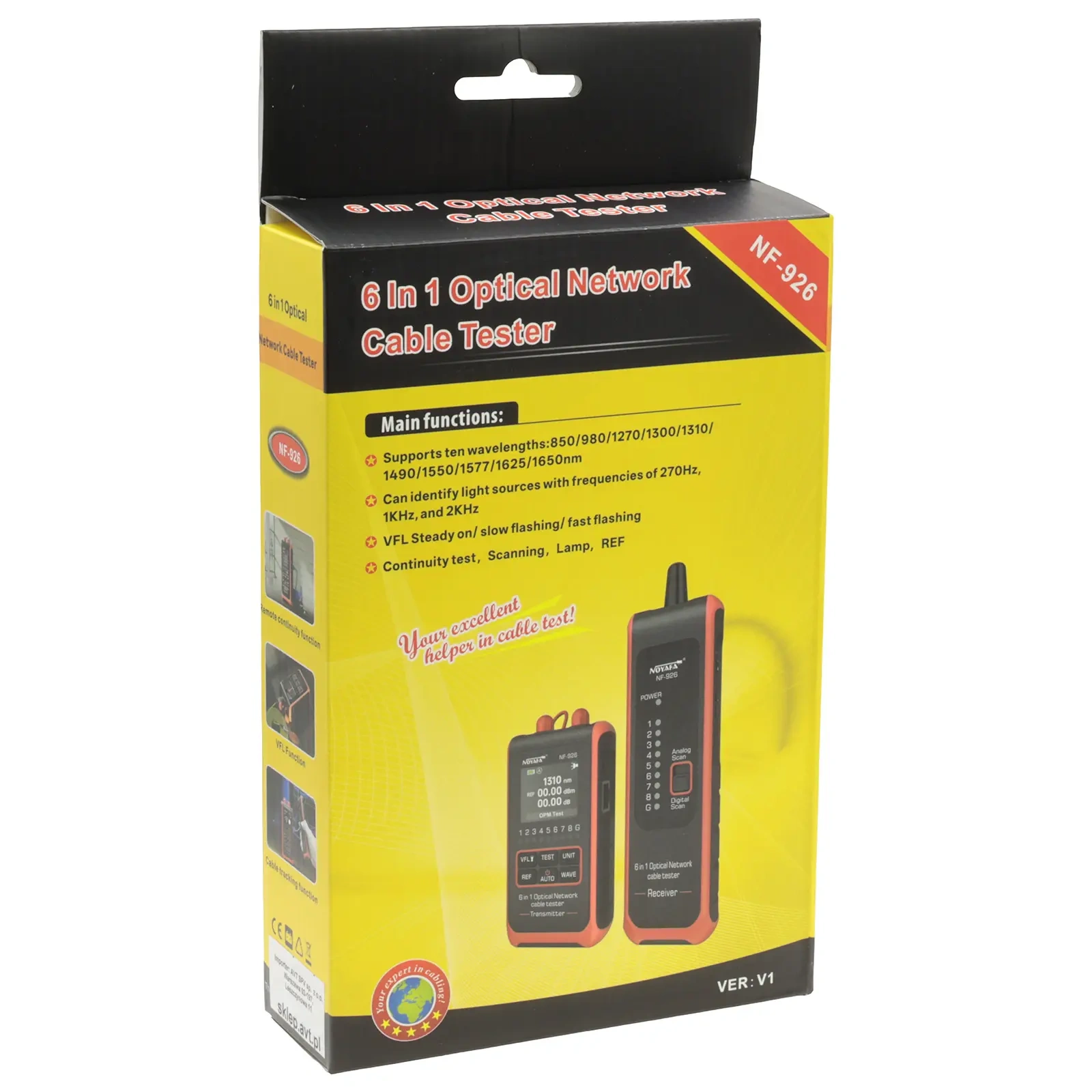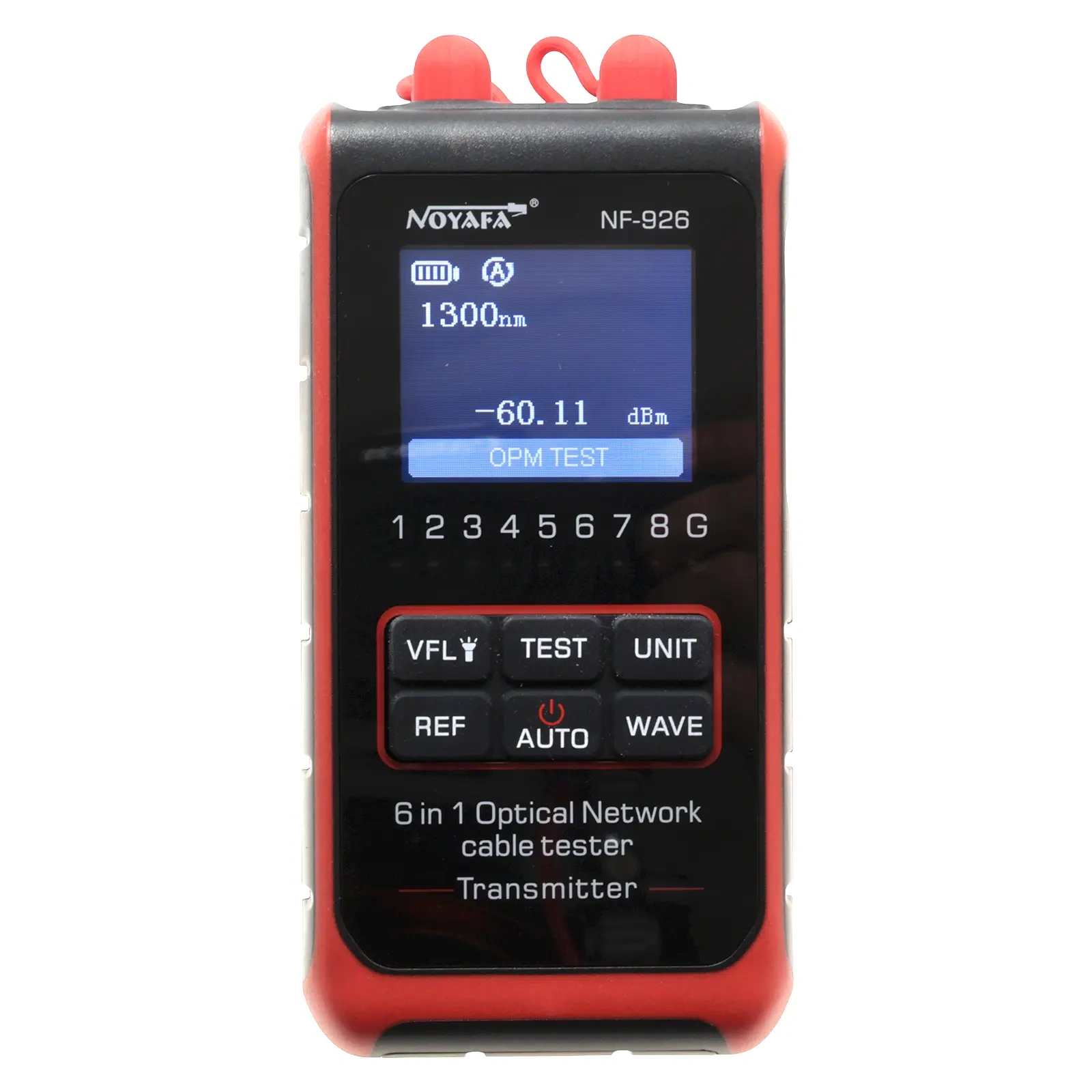 Noyafa NF-926 to wielofunkcyjny tester sieci optycznych 6w1, przeznaczony do kompleksowej diagnostyki instalacji światłowodowych. Urządzenie łączy w jednej obudowie funkcje miernika mocy optycznej (OPM), wizualnego lokalizatora uszkodzeń (VFL), źródła światła, testera ciągłości oraz identyfikatora włókien. Dzięki temu pozwala szybko sprawdzić jakość toru optycznego, zlokalizować uszkodzenia oraz zweryfikować poprawność połączeń – zarówno w instalacjach wewnętrznych, jak i zewnętrznych.