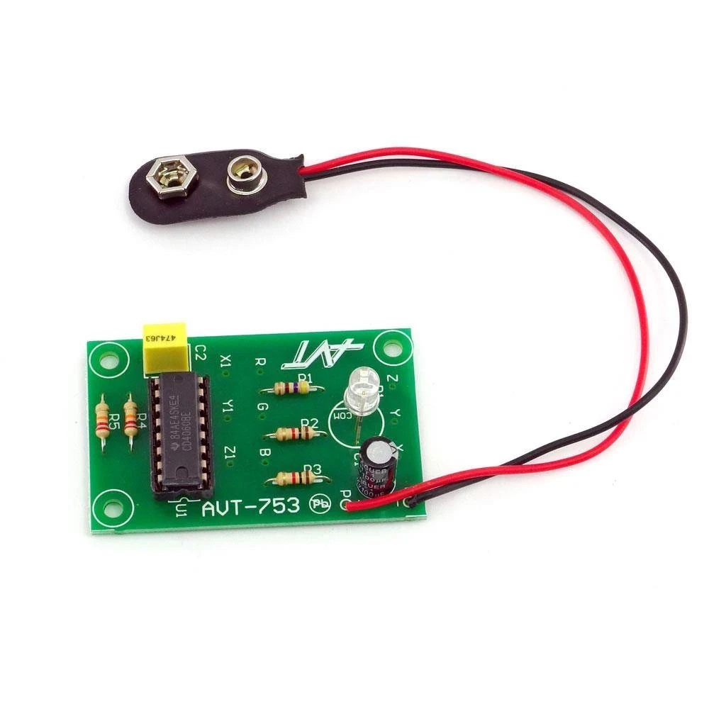 Bardzo prosty układ polecany osobom zaczynającym przygodę z elektroniką i wszystkim pasjonatom efektów świetlnych, możliwy do zmontowania i uruchomienia nawet przez początkującego elektronika. Głównym elementem jest trójkolorowa dioda LED o dużej jasności. Za jej wysterowanie odpowiedzialny jest licznik dwójkowy – układ scalony z popularnej serii CMOS 4000. Podczas pracy zmieniające się stany jego wyjść powodują pozornie przypadkowe włączanie odpowiednich kolorów. Ich skokową zmianę świecenia najwygodniej (i najciekawiej) jest obserwować poprzez element rozpraszający np. kawałek matowego tworzywa sztucznego.