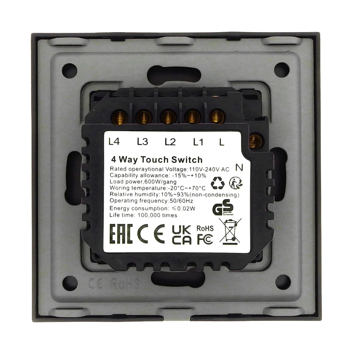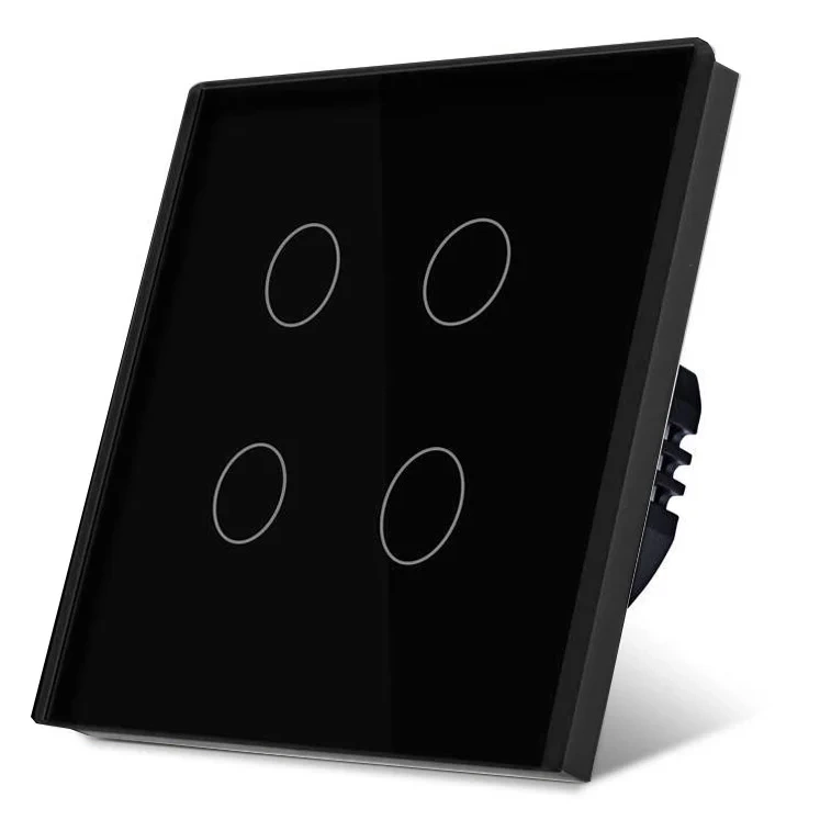 Czteropolowy włącznik dotykowy Tawoia Smart Home to zaawansowane rozwiązanie dla dużych pomieszczeń lub kompleksowego zarządzania oświetleniem. Dzięki minimalistycznemu szklanemu frontowi z wyraźnie oznaczonymi strefami dotyku, jest funkcjonalny i estetyczny zarazem.
