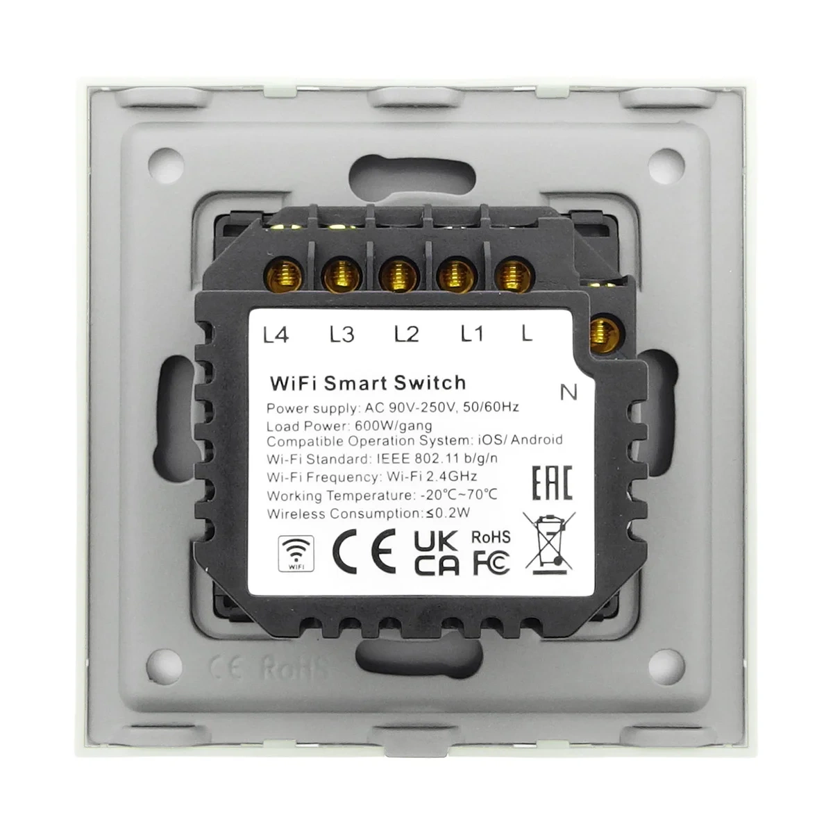 Czteropolowy włącznik dotykowy Tawoia Smart Home to zaawansowane rozwiązanie dla dużych pomieszczeń lub kompleksowego zarządzania oświetleniem. Dzięki minimalistycznemu szklanemu frontowi z wyraźnie oznaczonymi strefami dotyku, jest funkcjonalny i estetyczny zarazem.