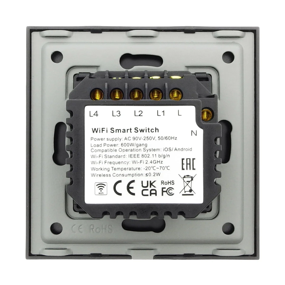 Czteropolowy włącznik dotykowy Tawoia Smart Home to zaawansowane rozwiązanie dla dużych pomieszczeń lub kompleksowego zarządzania oświetleniem. Dzięki minimalistycznemu szklanemu frontowi z wyraźnie oznaczonymi strefami dotyku, jest funkcjonalny i estetyczny zarazem.