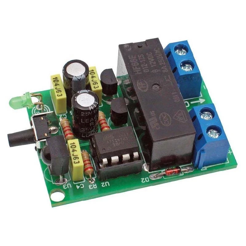 Prosty układ zdalnie sterowanego włącznika, który współpracuje praktycznie z dowolnym pilotem na podczerwień. Elementem wykonawczym jest 8-amperowy przekaźnik. Układ zasilany jest bezpiecznym napięciem 12V, a do wyjścia można dołączyć bezpośrednio żarówki LED 12V.