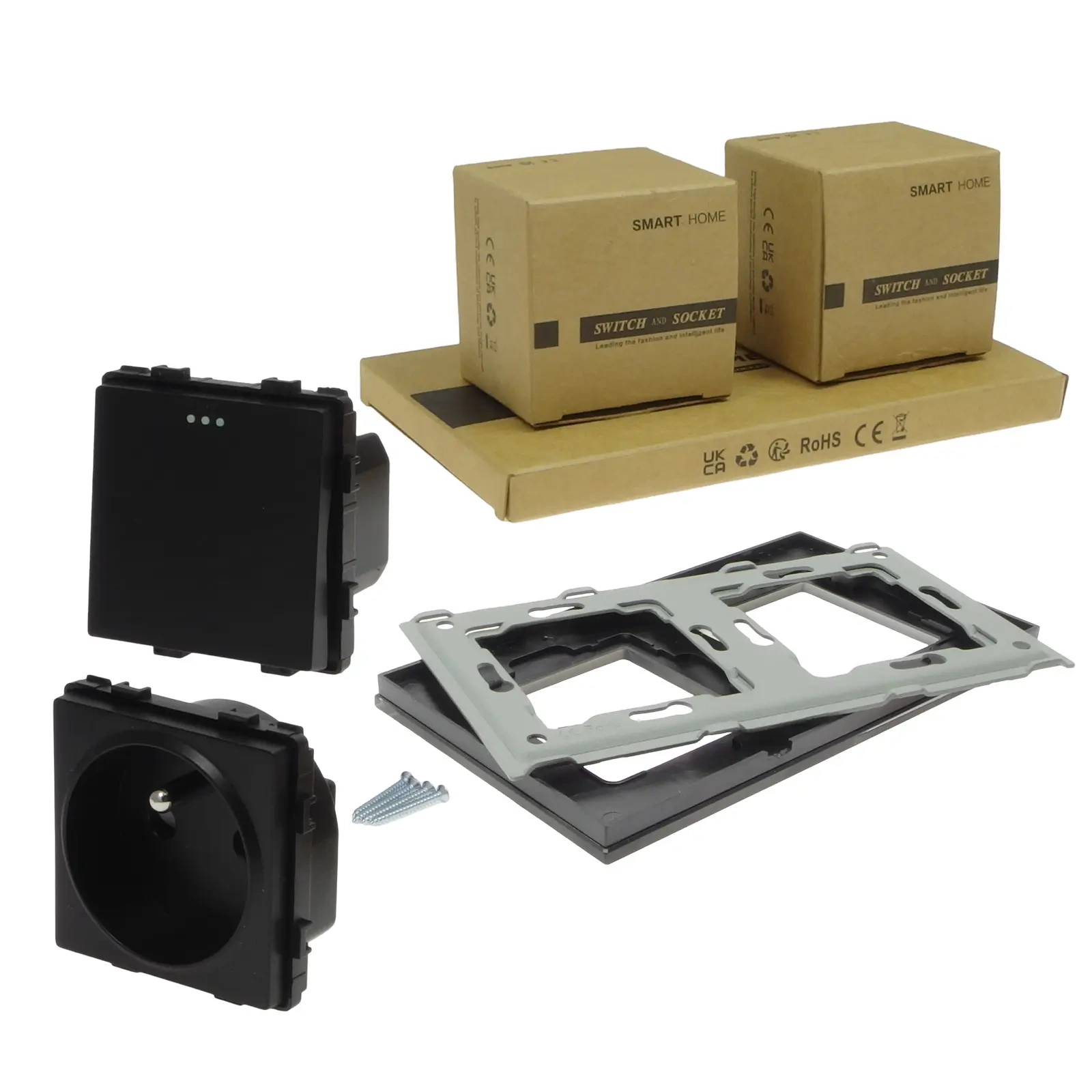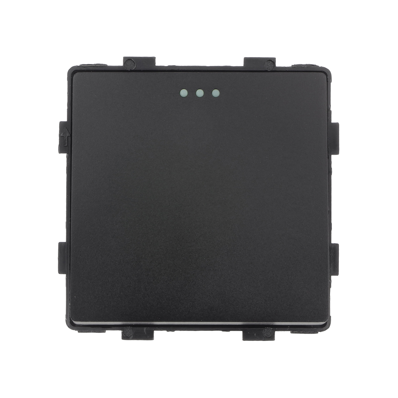 - Montaż modułu – wprowadź moduł włącznika do metalowej ramki, która jest w komplecie z ramką szklaną. Uwaga: oznaczenie "CE RoHS" ma być od strony ściany. Moduł zamontuj z wyczuciem na wcisk. Prawidłowo zamontowany moduł w metalowej ramce tworzy z nią stabilną całość.