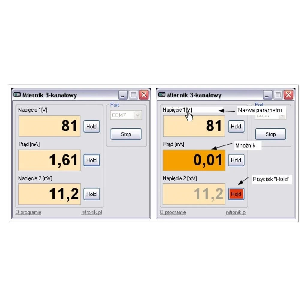 - możliwość podłączenia dzielnika napięcia wejściowego, program uwzględnia zmianę skali