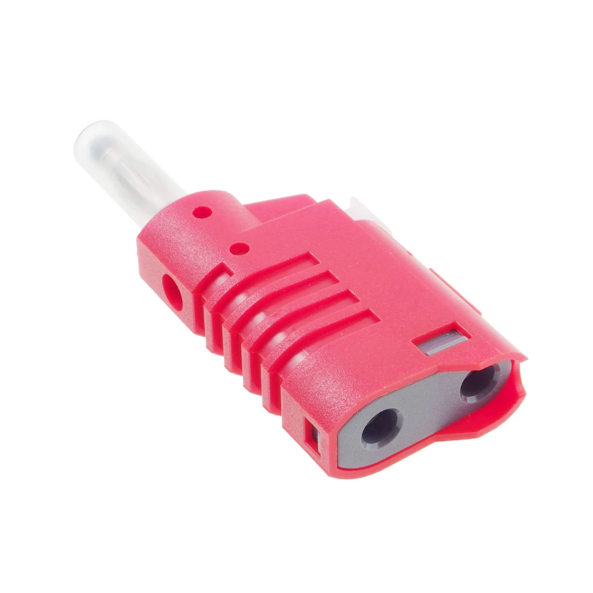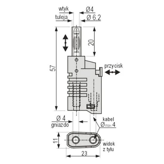Wtyk Ø4mm z gniazdem Ø4mm do dalszych połączeń wieżowych. Wtyk posiada zabezpieczenie przed dotykiem części metalowej oraz przed przypadkowym zwarciem przez wsuwaną tuleję osłonową i kapturek izolacyjny. Wygodny sposób przyłączania przewodu - przez przyciśnięcie przycisku, wsunięcie zarobionego przewodu i zwolnienie przycisku