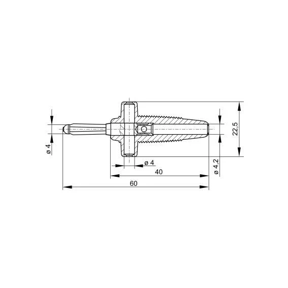 Wtyk Ø4mm ze sprężyną wiązkową z poprzecznym, dodatkowo osłoniętym króćcami otworem Ø4mm do dodatkowych połączeń. Miękka osłona wtyku odporna na nadepnięcie jest jednocześnie elastyczną odgiętką.