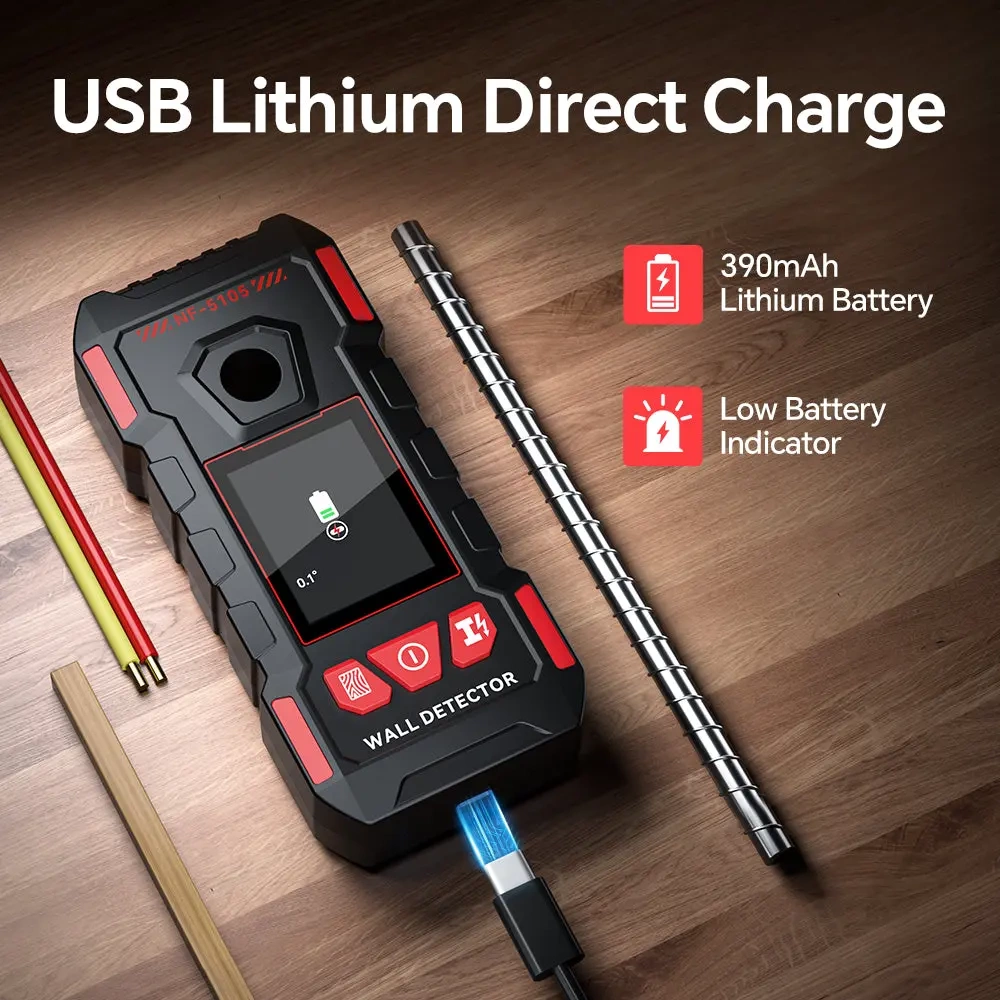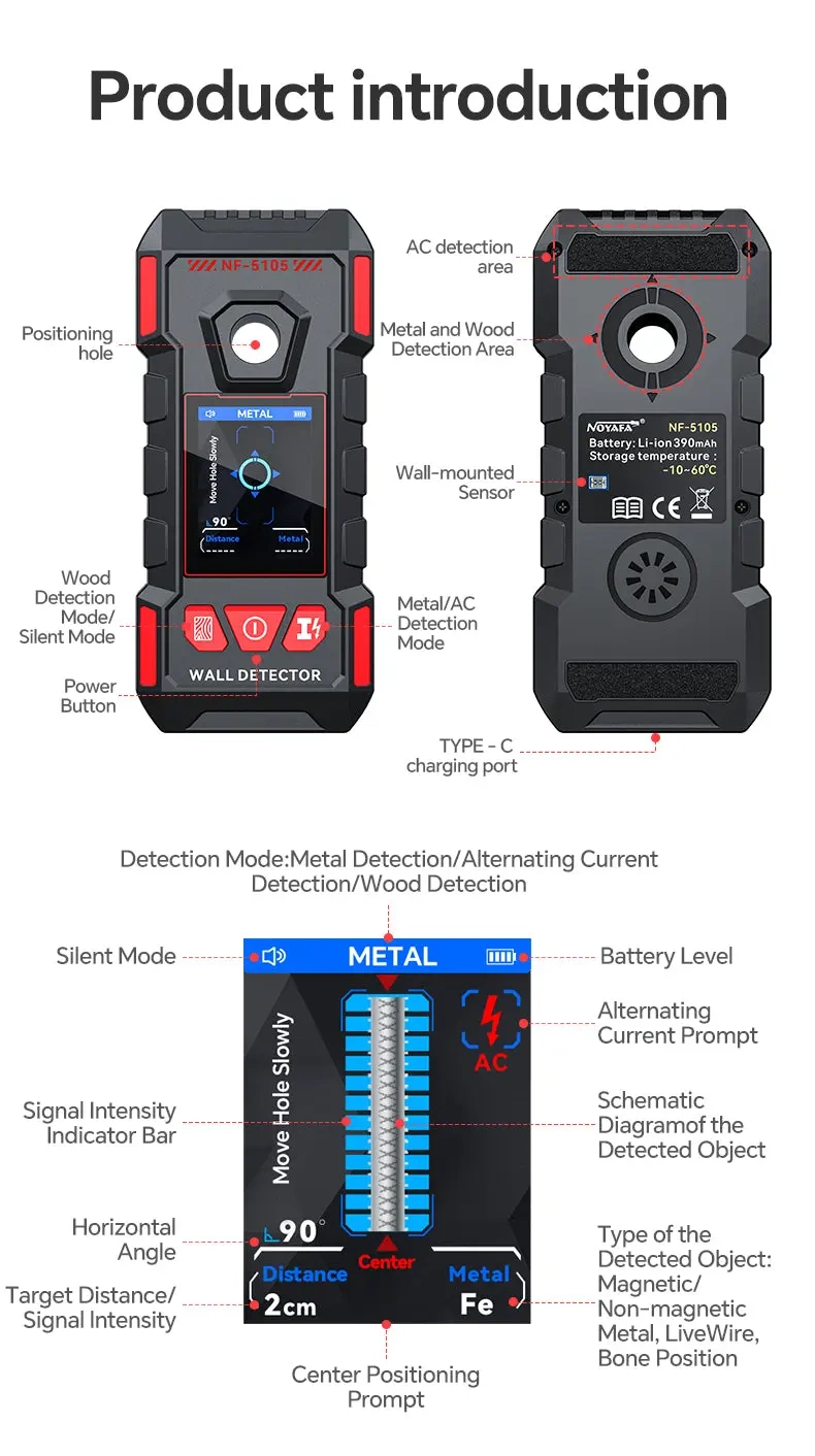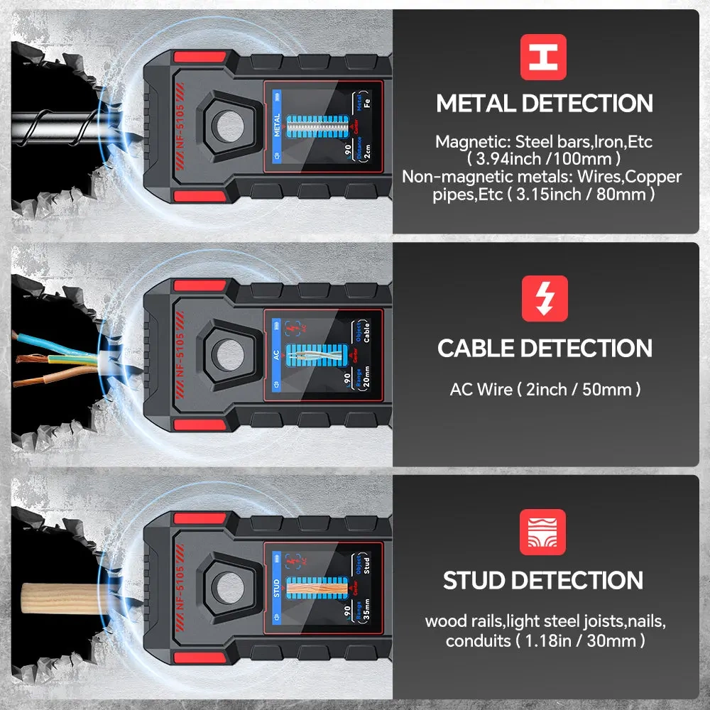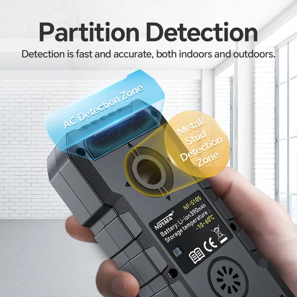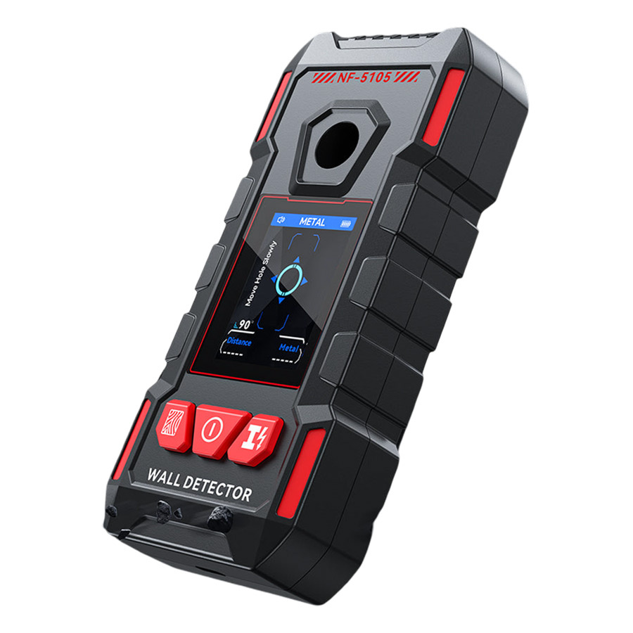 NOYAFA NF-5105 to profesjonalny detektor ścienny zaprojektowany do bezpiecznego wiercenia i prac montażowych. Dzięki wysokiej czułości i trybom wielofunkcyjnej detekcji pozwala szybko i precyzyjnie wykrywać rury, przewody pod napięciem oraz elementy drewniane ukryte w ścianach, sufitach i podłogach. Urządzenie jest niezastąpione podczas prac remontowych, stolarskich czy elektrycznych.