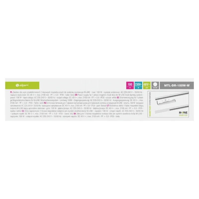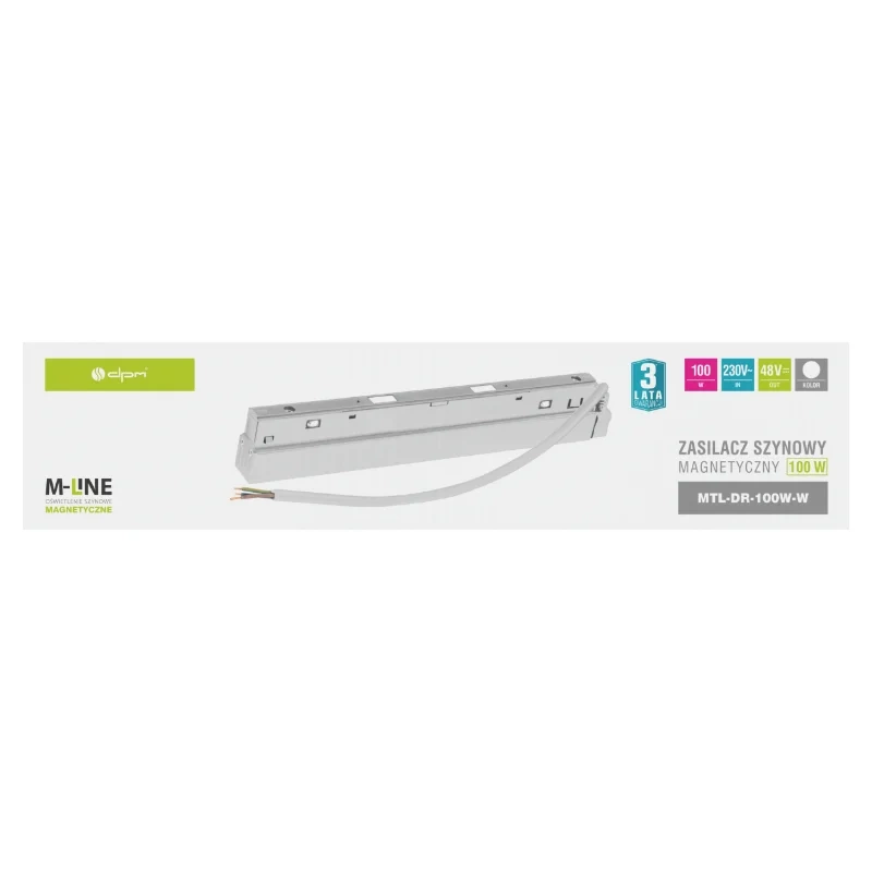 Zasilacz DPM M-LINE MTL-DR-100W to wysokiej jakości jednostka zasilająca przeznaczona do magnetycznych systemów oświetleniowych M-LINE. Urządzenie przetwarza napięcie 230 V AC na stabilne 48 V DC, gwarantując bezpieczne i efektywne zasilanie lamp magnetycznych, reflektorów oraz listw LED z serii M-LINE. Dzięki kompaktowej obudowie i białemu wykończeniu zasilacz można łatwo wkomponować w nowoczesne wnętrza lub ukryć w zabudowie sufitowej.