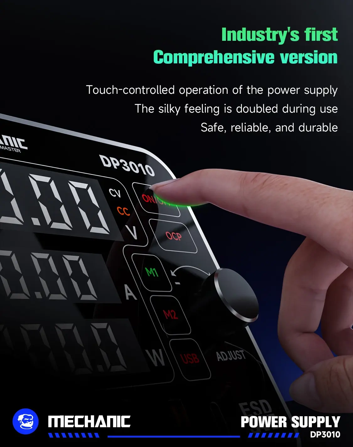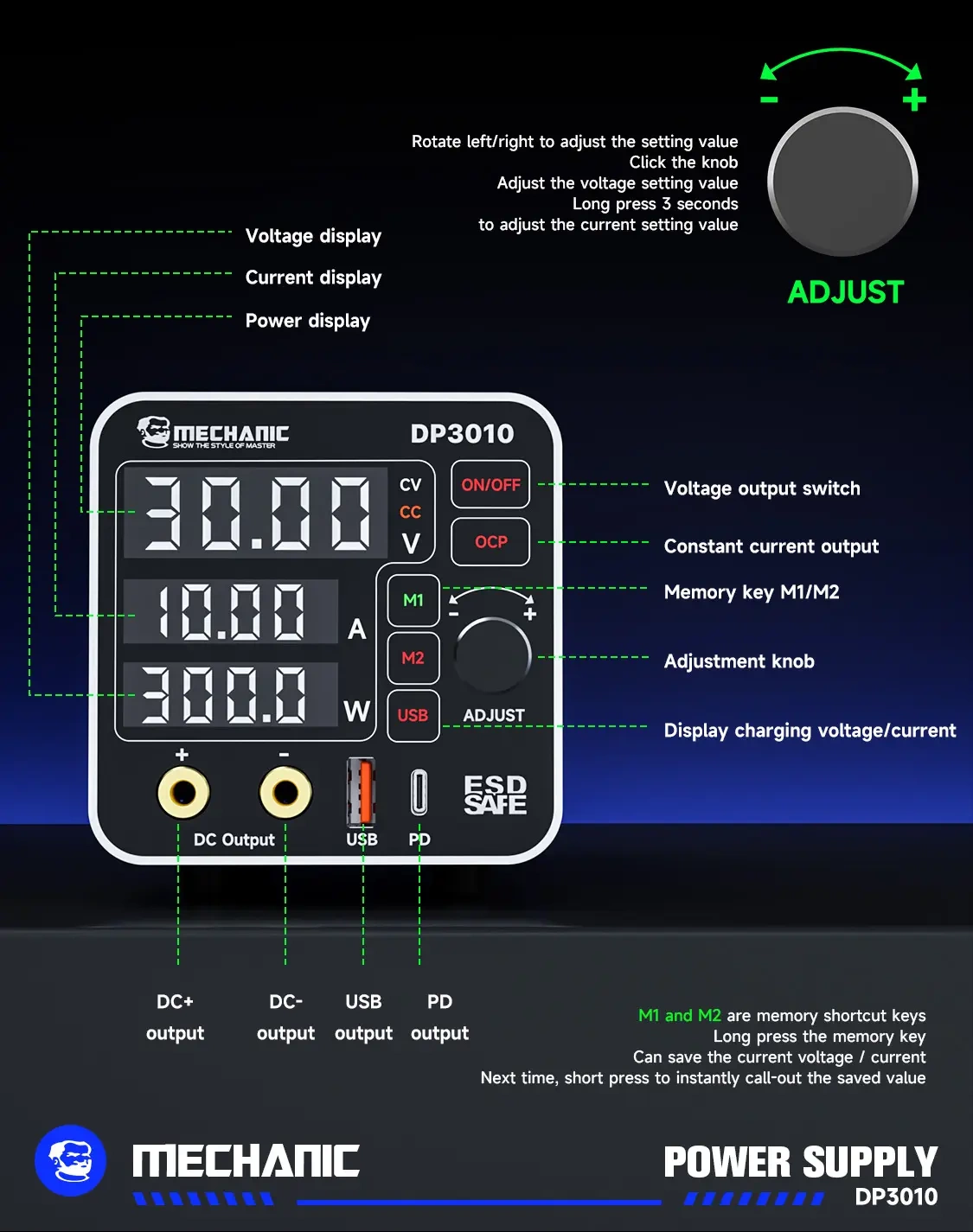 Model DP3010 wyróżnia się przyciskiem dotykowym, inteligentnym pokrętłem regulacyjnym, funkcją pamięci M1/M2, wyjściem USB oraz portem PD do ładowania urządzeń mobilnych. Obudowa została wykonana z odpornego stopu aluminium lotniczego, co poprawia trwałość i nadaje urządzeniu profesjonalny wygląd.