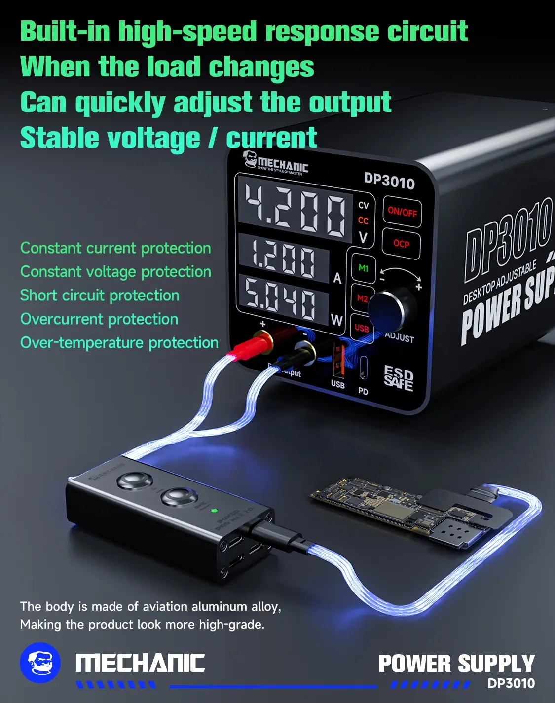 Mechanic DP3010 to kompaktowy, precyzyjny i wielofunkcyjny zasilacz laboratoryjny 30V/10A, zaprojektowany z myślą o hobbystach elektroniki, serwisach GSM, technikach naprawczych i profesjonalnych laboratoriach. Mimo niewielkich wymiarów oferuje imponującą moc do 300 W oraz wyjątkowo stabilne parametry wyjściowe. Dzięki zastosowaniu układów dużej dokładności, czterocyfrowym wyświetlaczom LED i szybkiemu torowi odpowiedzi, urządzenie zapewnia precyzyjną regulację napięcia i prądu nawet przy gwałtownych zmianach obciążenia.