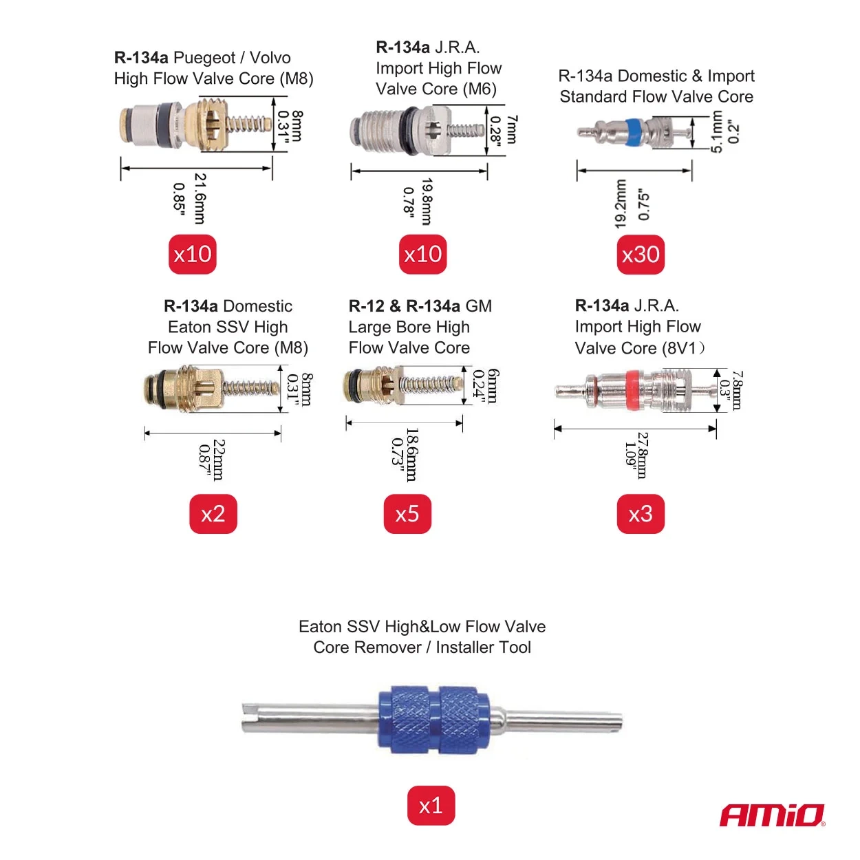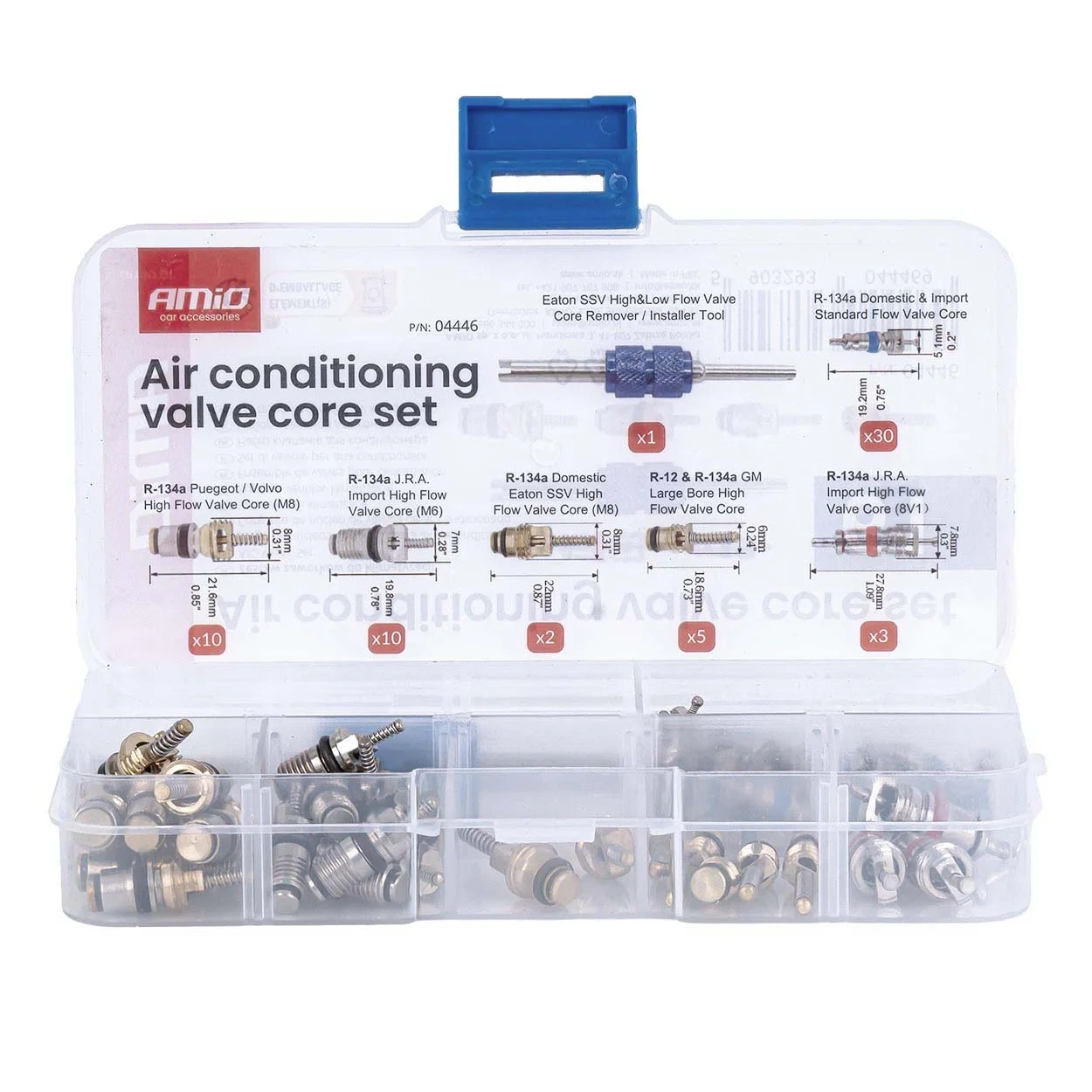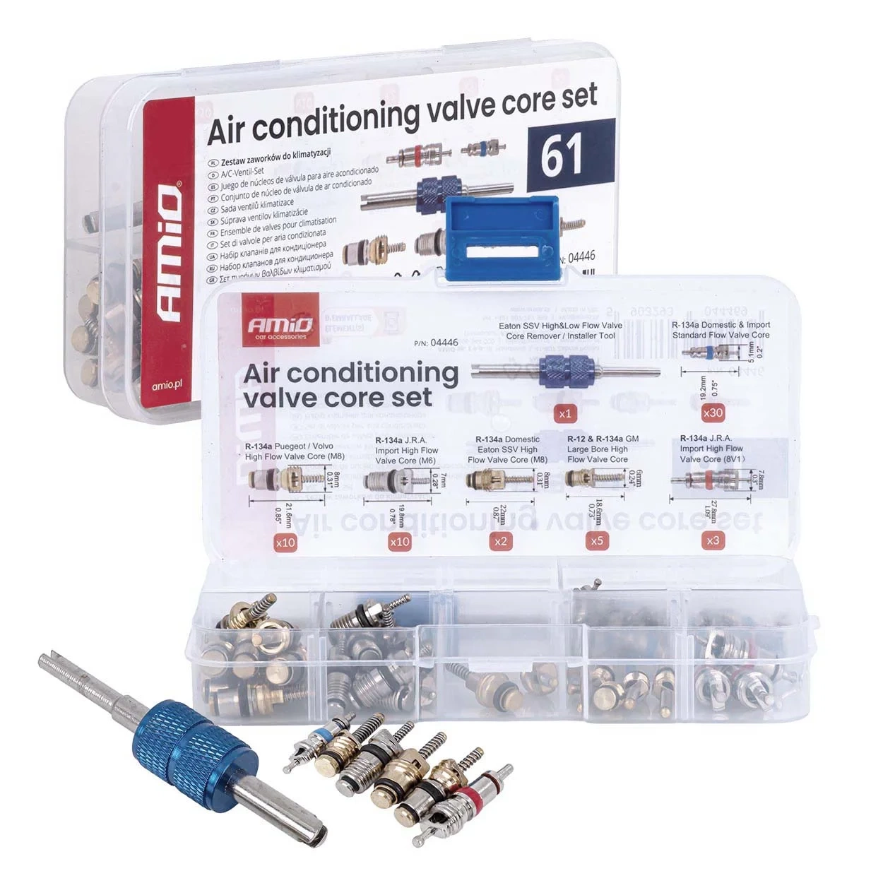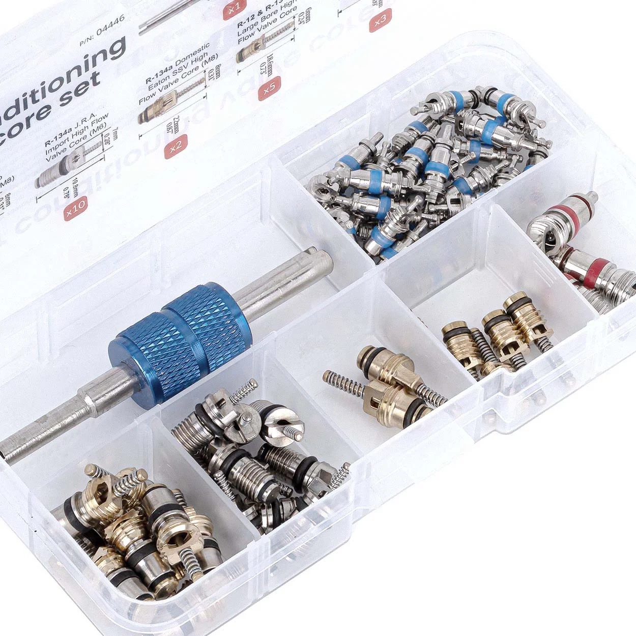 Profesjonalny zestaw zaworków do klimatyzacji, zawierający 61 elementów niezbędnych do serwisowania i naprawy systemów klimatyzacyjnych w pojazdach i urządzeniach chłodniczych. Zestaw umożliwia szybkie i precyzyjne wymiany zaworków w układach klimatyzacyjnych, zapewniając szczelność i prawidłowe działanie instalacji.