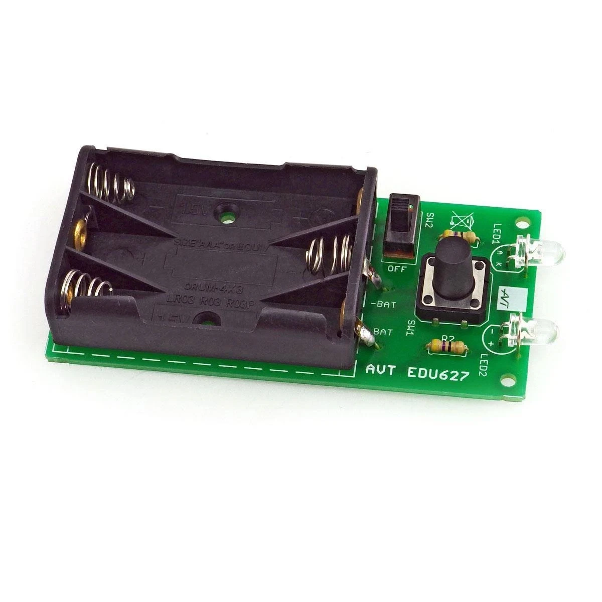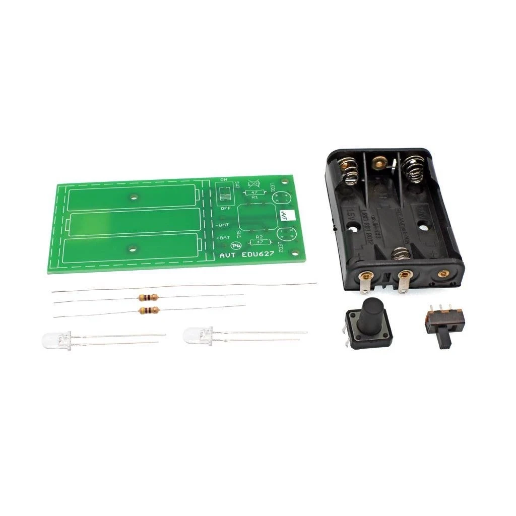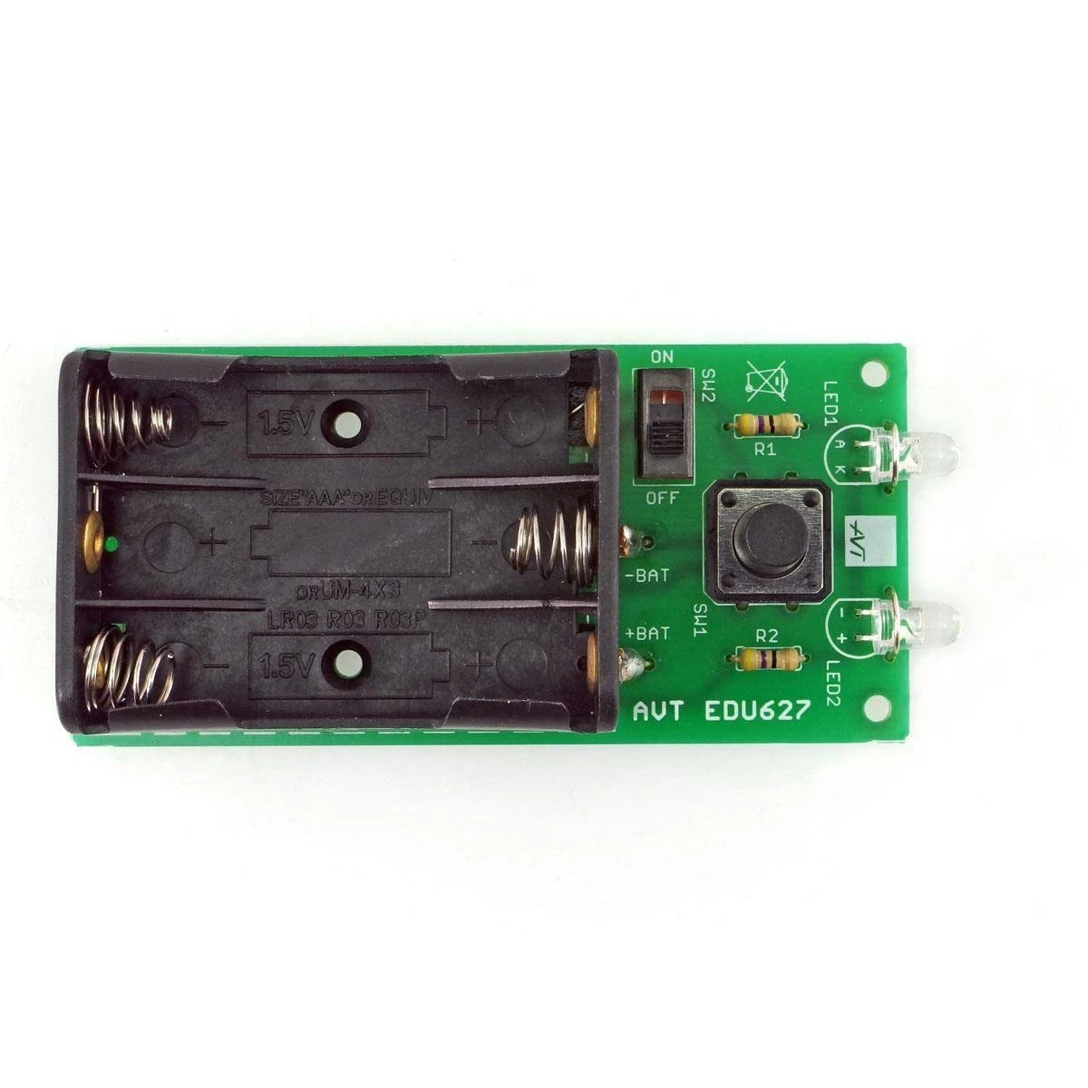 Zestaw elementów do budowy prostej latarki z dwiema diodami LED. Zestaw oprócz podstawowej funkcjonalności latarki będzie pomocny w nauce lutowania. Całość zasilana jest z 3 baterii AAA (R03). Zastosowanie przycisku i włącznika pozwala na uruchamianie latarki chwilowo lub na stałe. Płytka obwodu drukowanego ma wymiary 40 x 83mm dzięki czemu całość jest mała i dobrze leży w dłoni.
