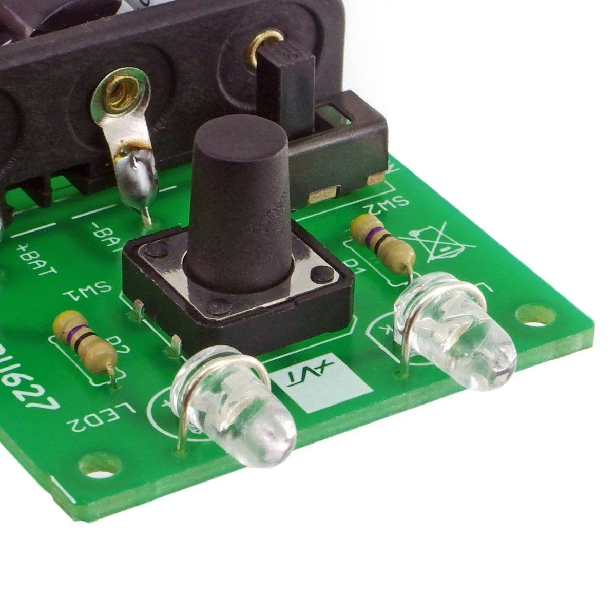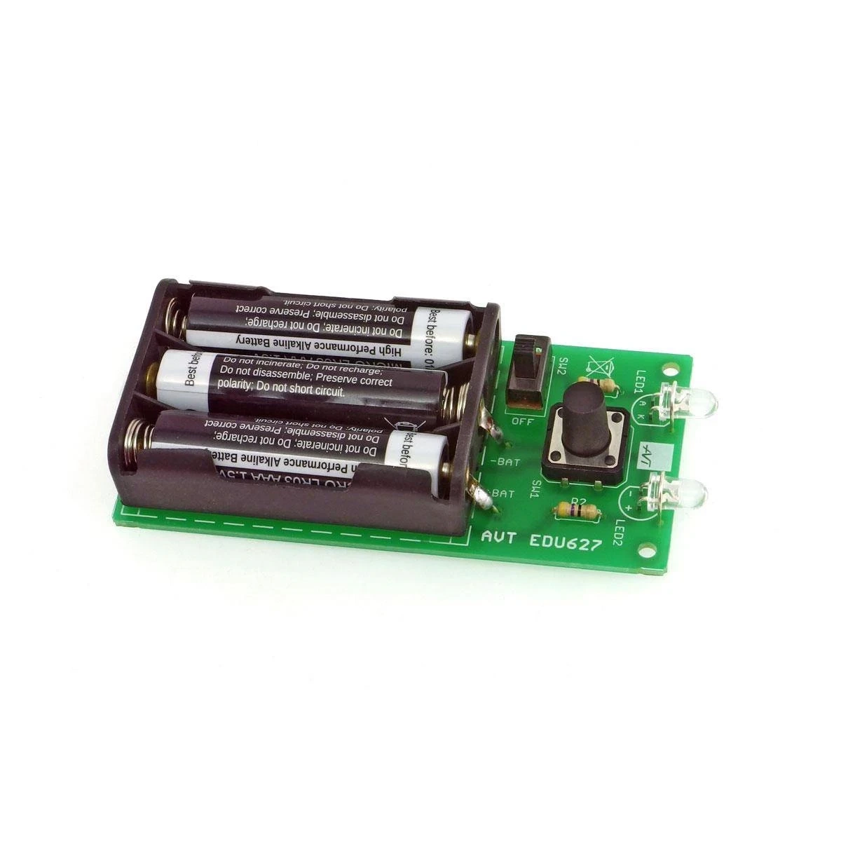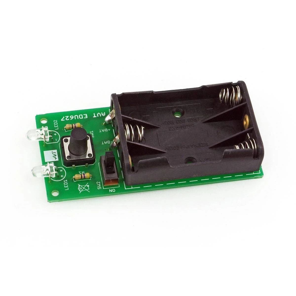 Zestaw elementów do budowy prostej latarki z dwiema diodami LED. Zestaw oprócz podstawowej funkcjonalności latarki będzie pomocny w nauce lutowania. Całość zasilana jest z 3 baterii AAA (R03). Zastosowanie przycisku i włącznika pozwala na uruchamianie latarki chwilowo lub na stałe. Płytka obwodu drukowanego ma wymiary 40 x 83mm dzięki czemu całość jest mała i dobrze leży w dłoni.