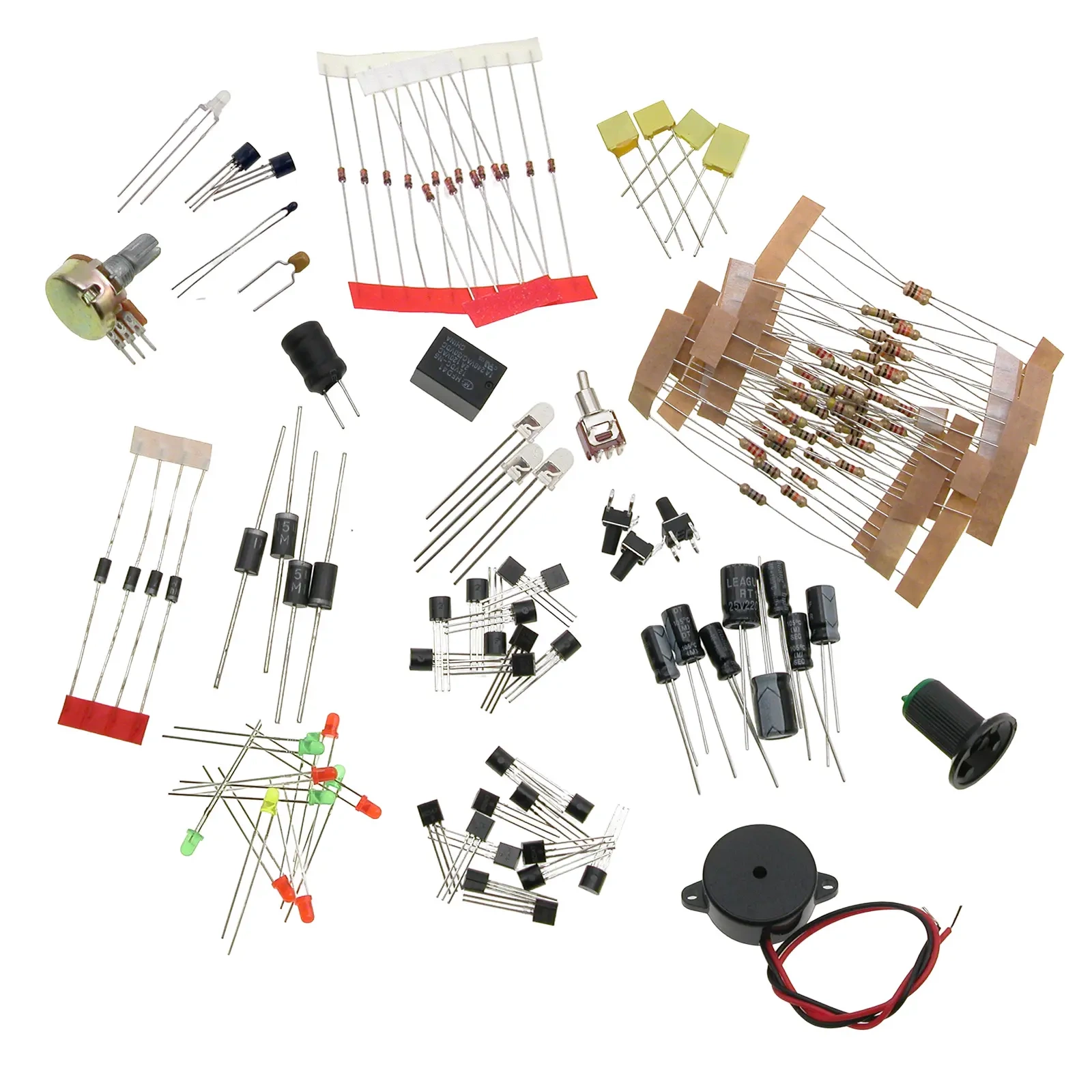 - Rezystory: 10 Ω, 100 Ω, 220 Ω, 470 Ω, 1 kΩ, 2.2 kΩ, 10 kΩ, 22 kΩ, 47 kΩ, 100 kΩ, 220 kΩ, 1 MΩ, 10 MΩ