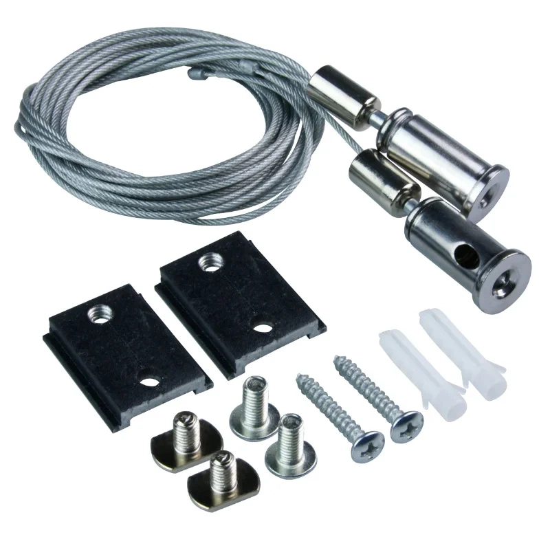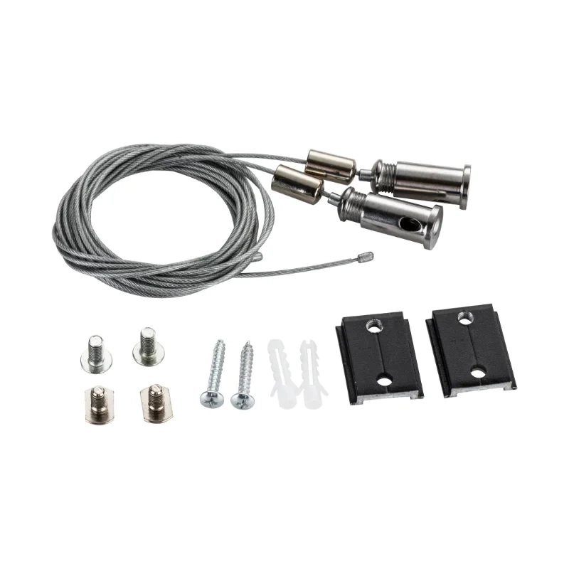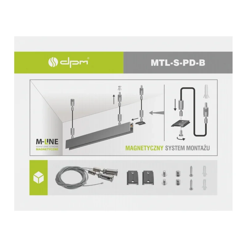 Zestaw MTL-S-PD zawiera wszystkie niezbędne elementy do wykonania montażu - linkę stalową, mocowanie sufitowe oraz uchwyt do szyny magnetycznej. Instalacja jest prosta i nie wymaga specjalistycznych narzędzi.