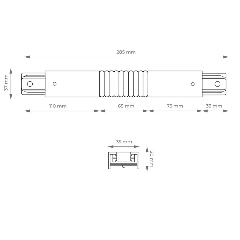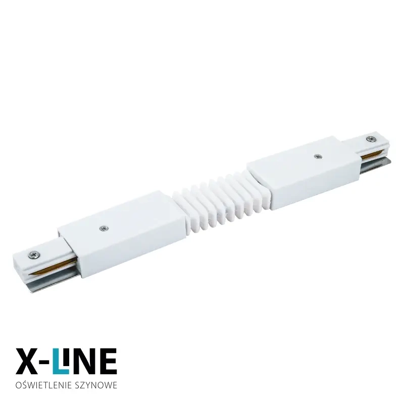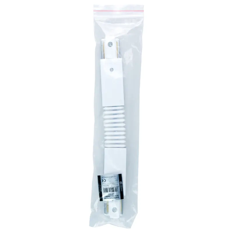 Elastyczna złączka szynowa do montażu szyn oświetleniowych 1-fazowych DPM. Złączka elastyczna pozwala na tworzenie nieregularnych kształtów i zaokrąglonych narożników w ciągach oświetleniowych na ścianie lub suficie. Łączniki szynowe przekazują napięcie do kolejnej szyny z łącznika zasilającego zamocowanego na pierwszej szynie w ciągu.