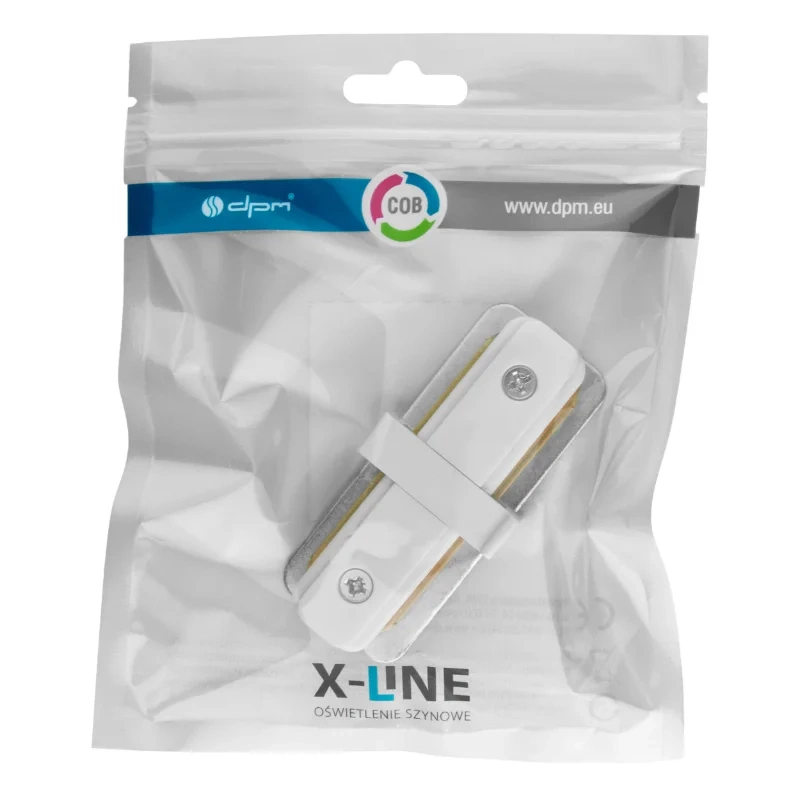 Złączka szynowa do montażu szyn oświetleniowych 1-fazowych DPM w linii prostej. Złączka "I" pozwala na tworzenie kilkunastometrowych ciągów oświetleniowych na ścianie lub suficie. Łączniki szynowe przekazują napięcie do kolejnej szyny z łącznika zasilającego zamocowanego na pierwszej szynie w ciągu.