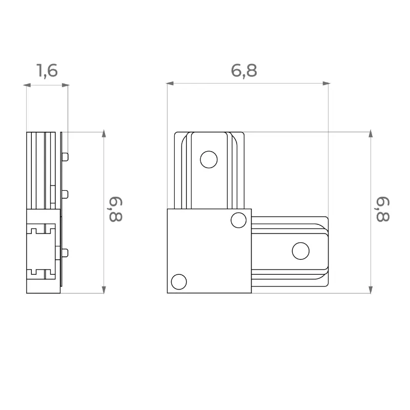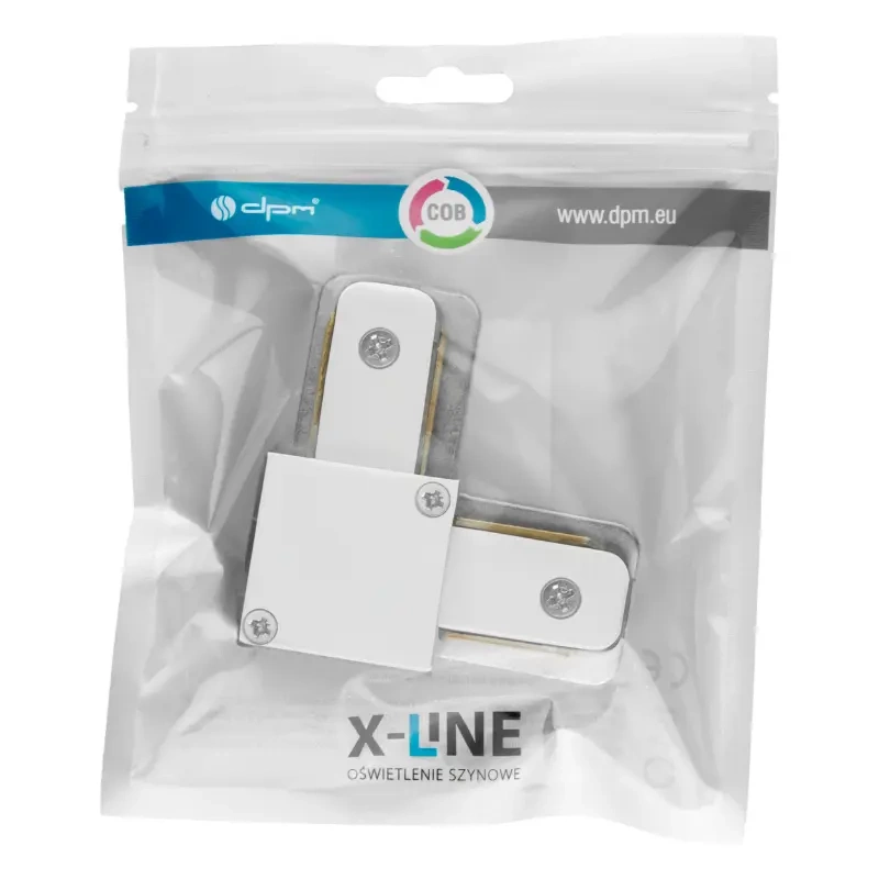 Złączka szynowa do montażu szyn oświetleniowych 1-fazowych DPM pod kątem prostym. Złączka "L" pozwala na tworzenie geometrycznych ciągów oświetleniowych ścianie lub suficie. Łączniki szynowe przekazują napięcie do kolejnej szyny z łącznika zasilającego zamocowanego na pierwszej szynie w ciągu.