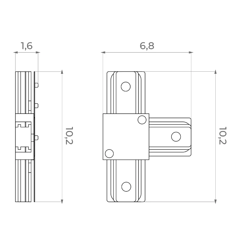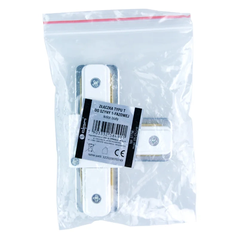 Złączka szynowa do montażu szyn oświetleniowych 1-fazowych DPM pod kątem prostym. Złączka "T" pozwala na tworzenie rozgałęzionych w 3 kierunkach ciągów oświetleniowych na ścianie lub suficie. Łączniki szynowe przekazują napięcie do kolejnej szyny z łącznika zasilającego zamocowanego na pierwszej szynie w ciągu.