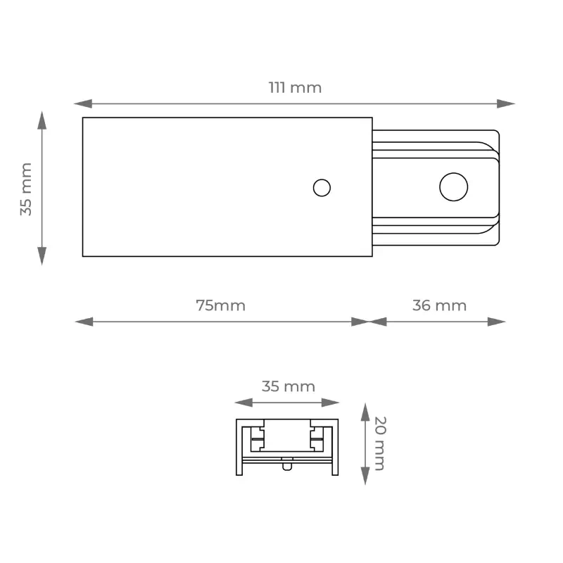 Zestaw złączek końcowych do szyn oświetleniowych 1-fazowych DPM. Złączka zasilająca umożliwia podłączenie szyny bezpośrednio do sieci zasilającej AC 230 V~. Zasilanie przekazywane jest do wszystkich szyn połączonych w jeden ciąg oświetleniowy. Złączka końcowa zapobiega wysunięciu reflektora lub lampy poza ciąg szynowy.